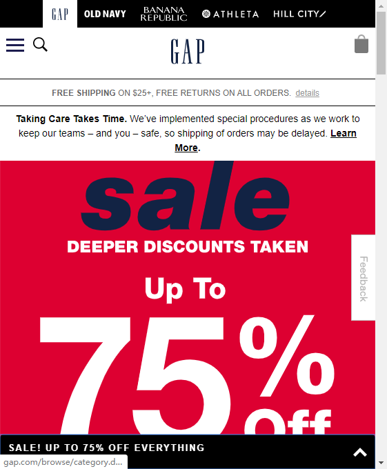 而GAP的官网则显示,目前所有商品都在促销销售,以期夹缝求生。