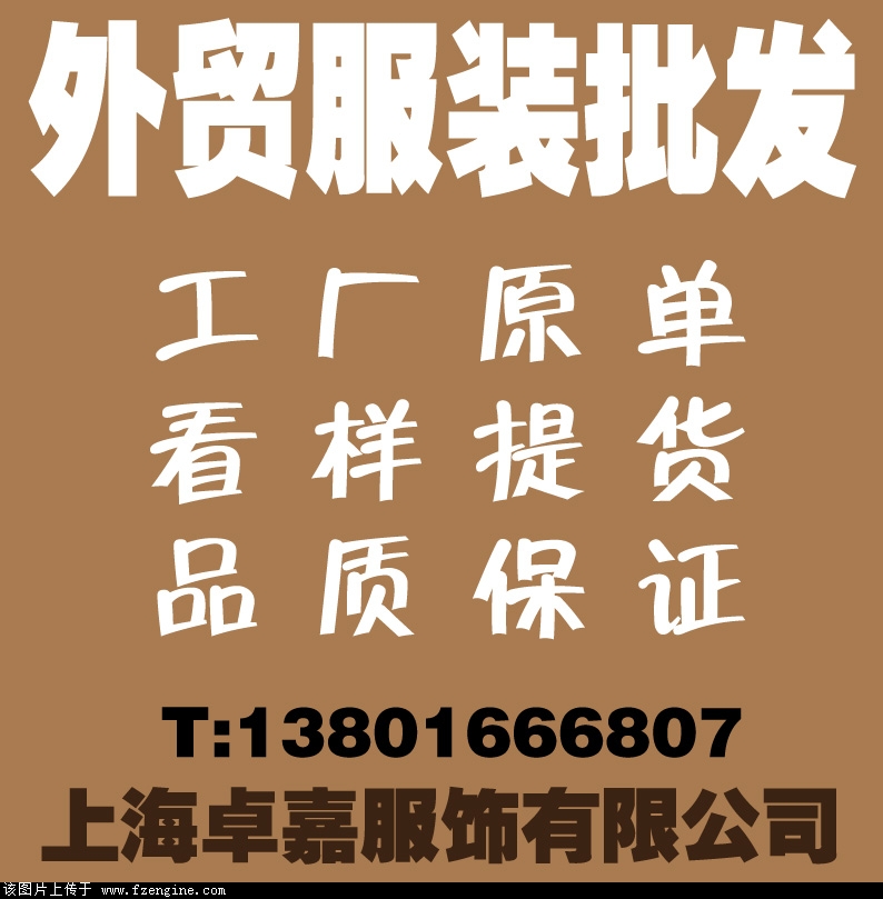 ★★★★长期供应外贸库存服装批发 上海服装厂家一手货源★★★★ 1.长期供应各类外贸服装,所售商品均为我厂出口多余的外贸服装为主,所有服装都是原单正品,无仿单及跟单! 2.现长期对外供应我厂外贸库存服装,以20岁到45岁的女装为主,有T恤、连衣裙、外套、针织衫等等,具体内容需去市区仓库看样。无任何起批限制,拿多拿少均可,所有库存服装均为整单,码数颜色齐全,寻求能够长期合作的批发商、零售商! 3.另外我厂可以承接订单来样生产,内外贸均可,单款生产量不低于1000件! 4.需要批发的,必需到我厂仓库去看,小批量的可以当场提货,大批量的需来厂区自提,无照片提供;如有疑问,可联系仓库:13801666807 市区仓库地址:上海市虹口区东大名路391号1037室(北外滩,靠近旅顺路口,在一楼半的位置)市区看样时间:每周2、每周5,上午10点到下午3点本条信息长期有效
