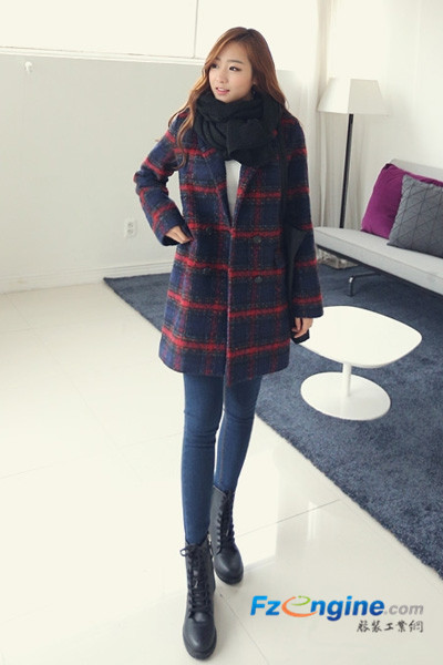 格子大衣经典优雅,直筒版型舒适显瘦,线条十分流畅,显得很有质感。藏蓝色和红色结合在一起,低调不张扬,不显沉闷,配紧身牛仔裤简洁干练。