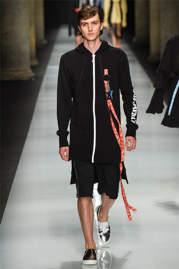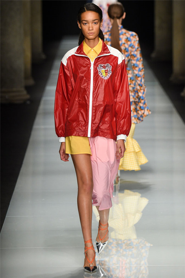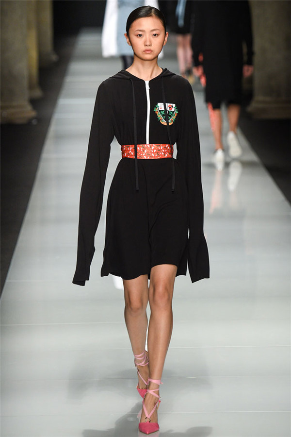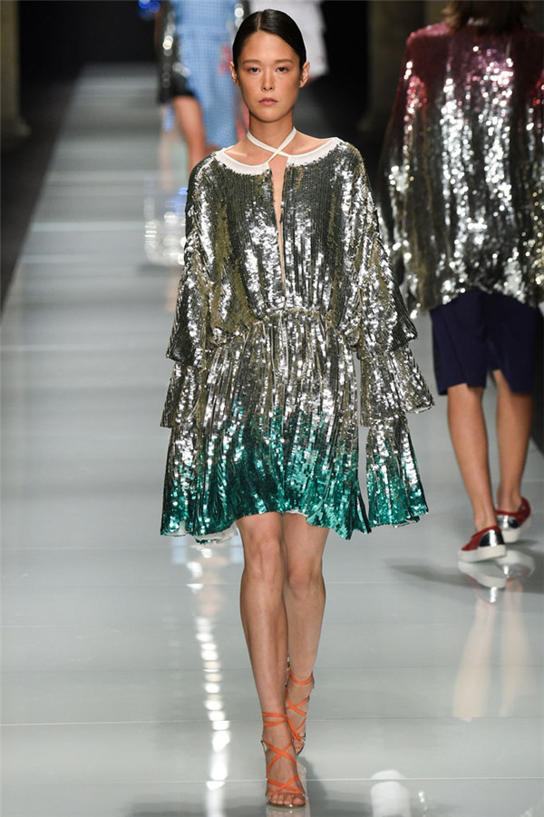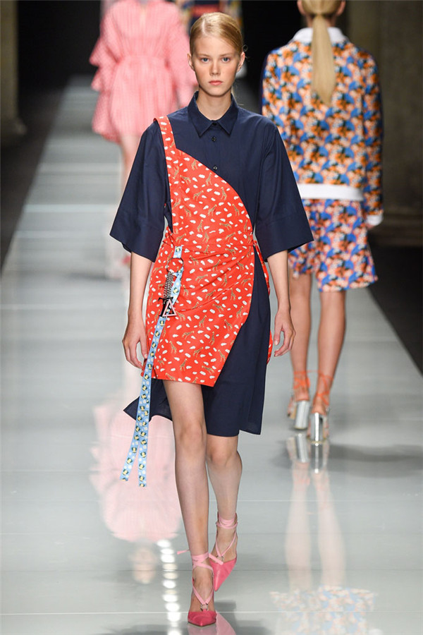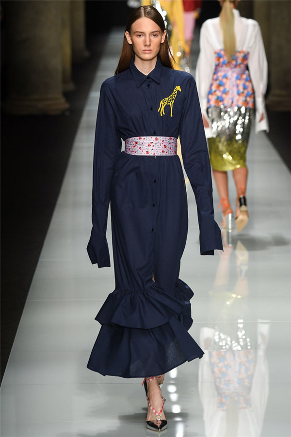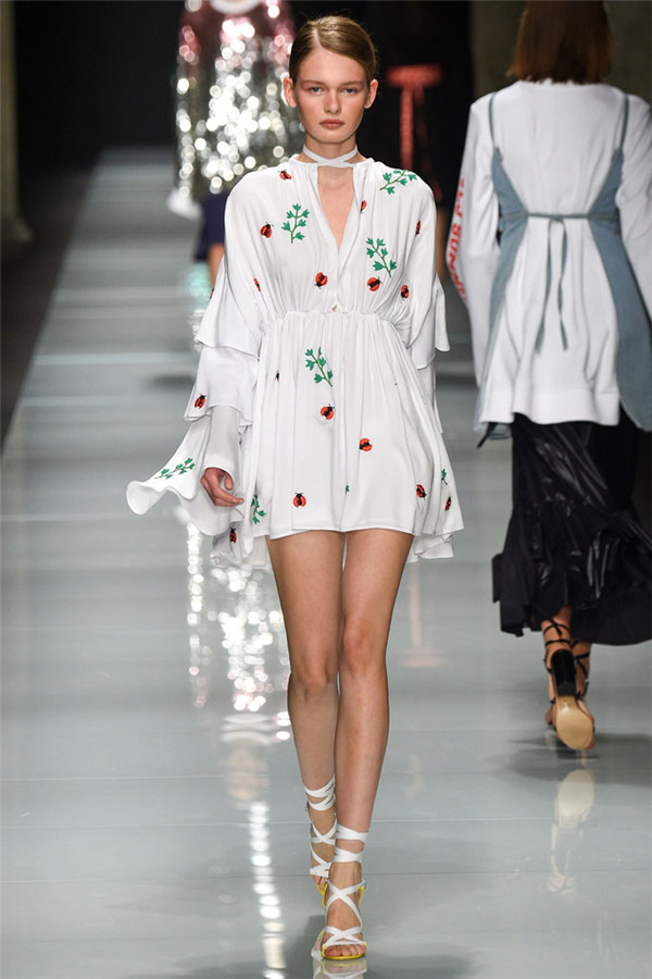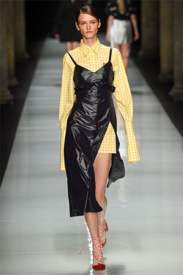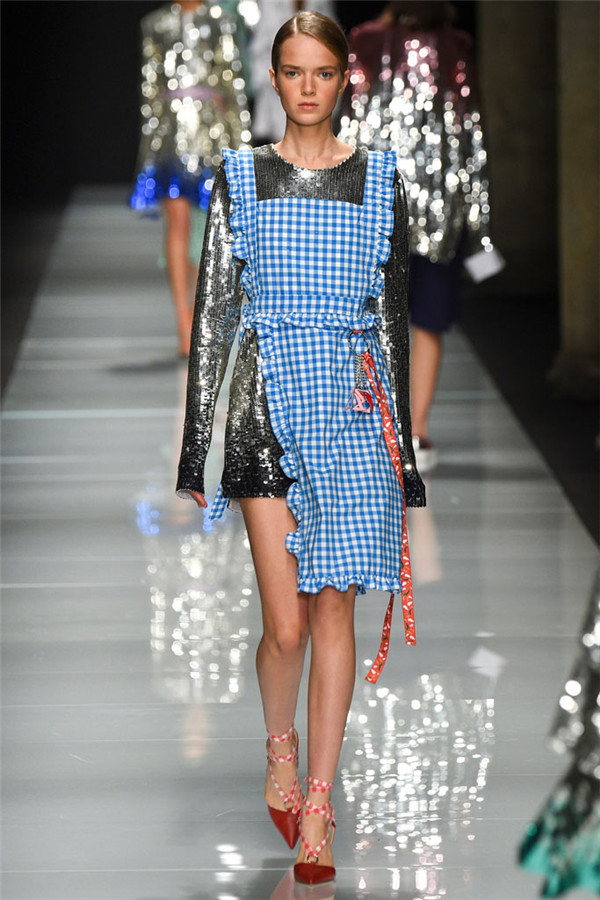 荷叶边装饰被成功地运用在了设计中,比如在那些高开衩的长衬衫式连衣裙以及颈部系带的格子和复古花朵围裙上。从美剧《Little House on the Prairie》中获得的灵感与单肩亮片腰带或有着随心所欲的徽章图案的尼龙小方格(一种校队风格和哈灵顿风格的结合体)相混合,有的模特腰上还系着日本风格的腰带。这两位设计师也非常热衷于露出一条腿的开衩裙,因为本次系列中三分之二的裙子都有开衩。