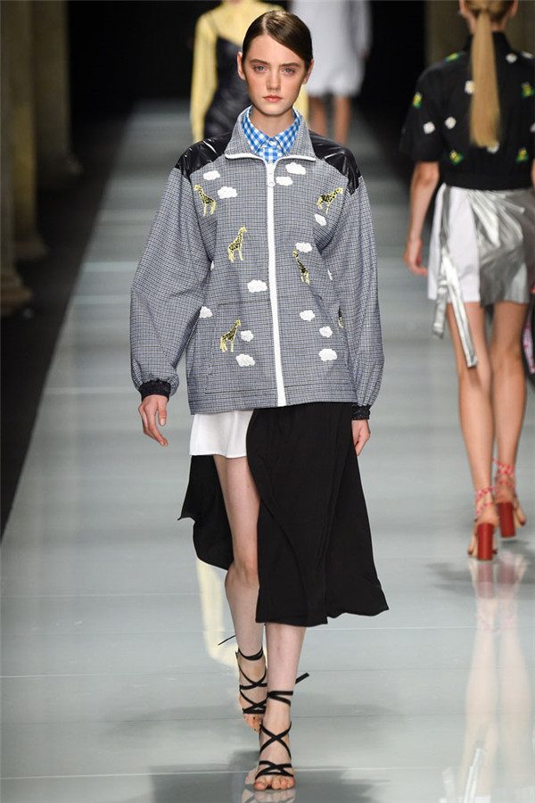 意大利时尚品牌 Au Jour Le Jour 于米兰时装周发布2017春夏系列时装秀。这次的系列温和地重复了“大学女生联谊会”这一概念。这些联谊会的会员身份常常通过希腊字母和印有长颈鹿、狮子、瓢虫,以及海豚图案的徽章和花纹表现出来。