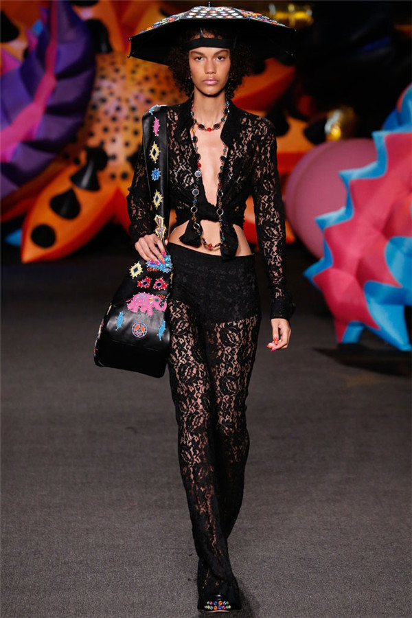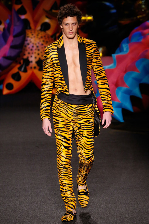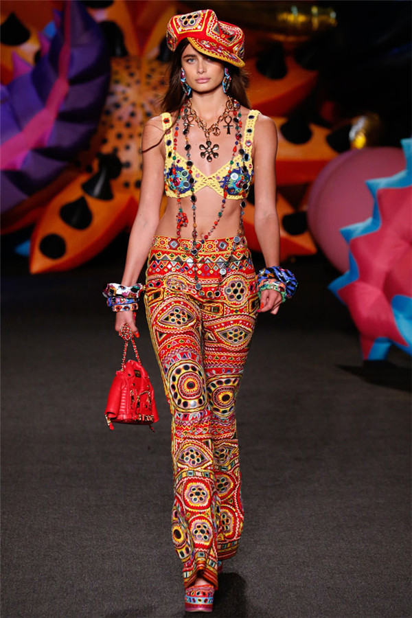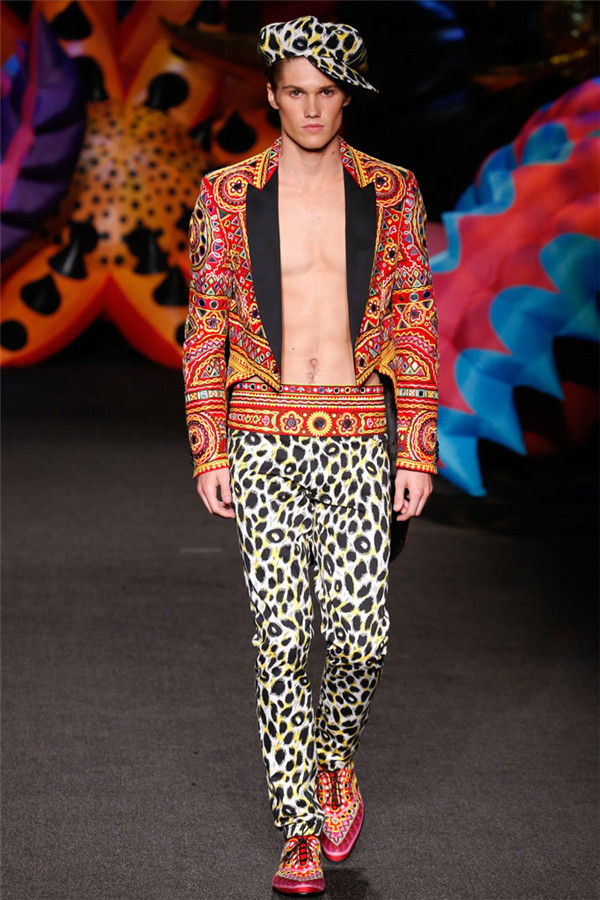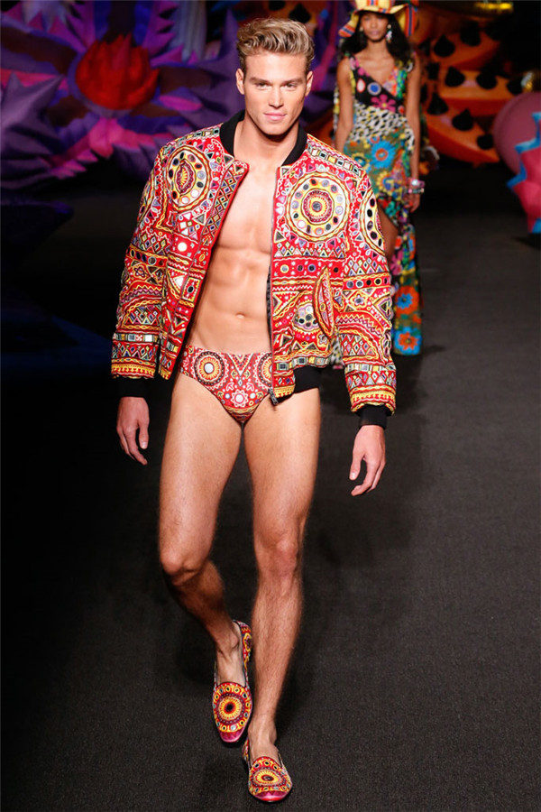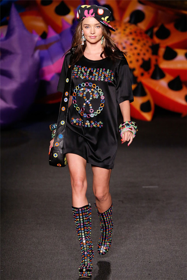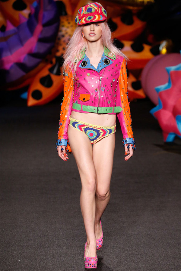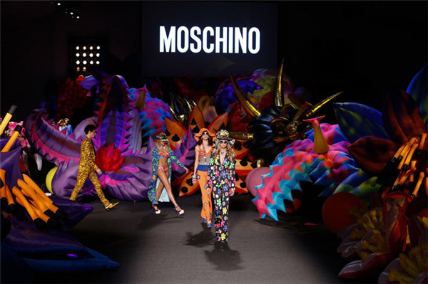 当地时间6月11日,Moschino(莫斯奇诺)于洛杉矶发布2017早春度假系列女装和2017春夏男装系列。丰富的色彩、眼花缭乱的印花、搞怪的设计贯穿全场,T台上的花样男女们带来了浓烈的春的气息。