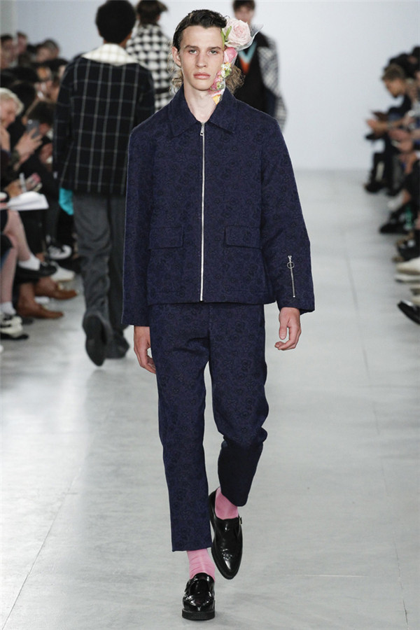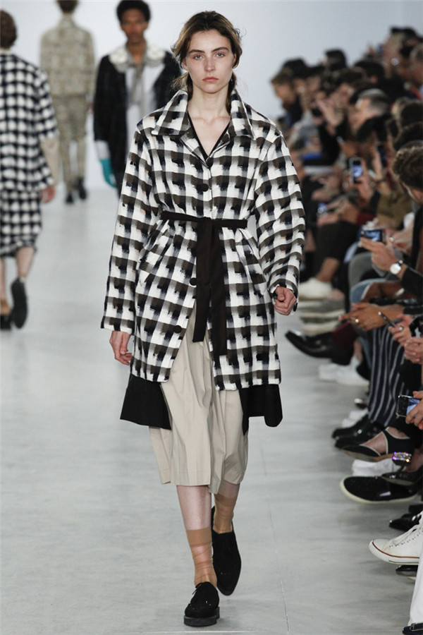 当地时间6月11日,Agi & Sam 于伦敦男装周发布2017春夏男装系列,本季品牌在实穿度上有了新的尝试,并且风格更具有辨识度。设计师十分偏爱格子和低调内敛的色彩组合,并在这季中运用到极致。宽松的裤脚和浑圆的肩头试图将英伦雅痞的出众品位规则化,对襟西服、廓形风衣、中袖开衫等等长短不一的外套,与错综交错、深浅不一的黑白格和黑白条纹实力解读层次感玩法。