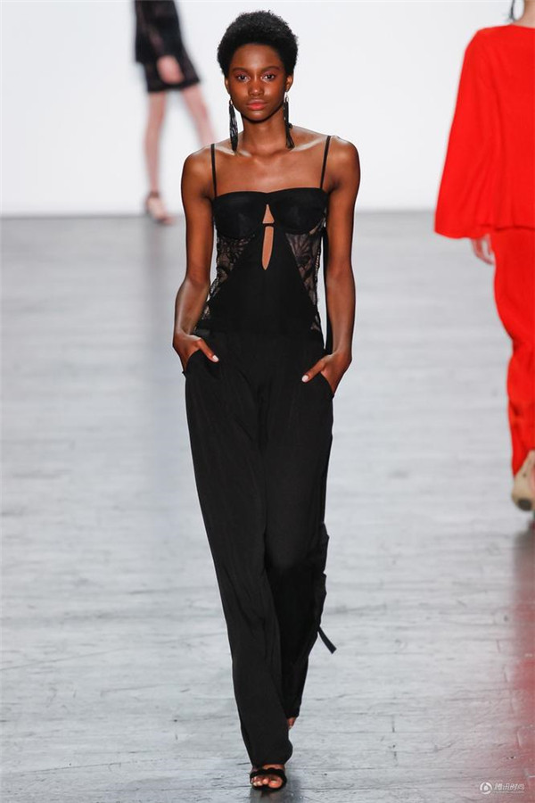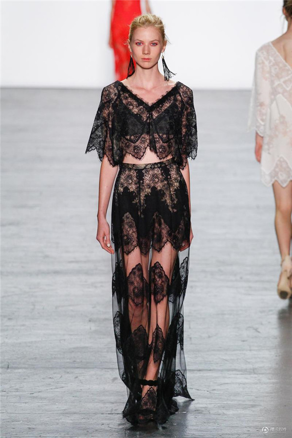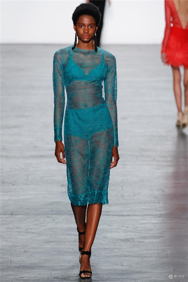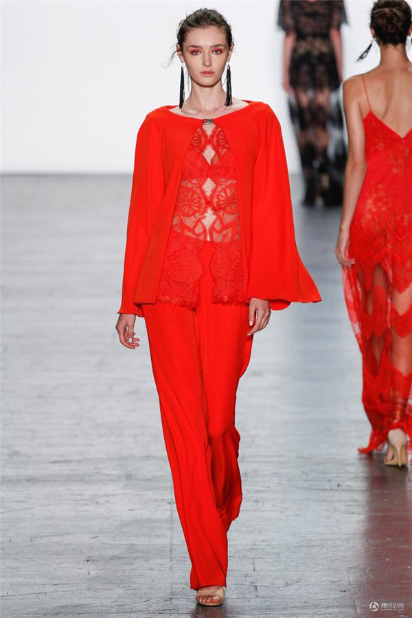 如果说塔达希 (Tadashi Shoji) 2017春夏系列服装是一幅充满东方韵味与极端女人味相融合的水墨画最不为过。跟从塔达希的脚步穿过庭院、窄巷和桥梁,来到一个空旷通亮的画室,随意翻看,我们不禁对吴俊勇的艺术作品《飞舟》产生浓浓的钦佩之情,而当清风拂过时,那画作中的生灵幻化为温婉细腻的华服,悄然飘逸、清澈纯净。Tadashi每一季的作品都不会让人失望,在本季中,他运用了东方的刺绣元素、精美的蕾丝和羽毛、廓形的裁剪,来表现自由与精致的结合。秀场上以红色、蓝色、绿色以及黑白为主,模特精致干净妆容上的红色眼影、若隐若现的镂空蕾丝,都是极致与奢华的完美体现。