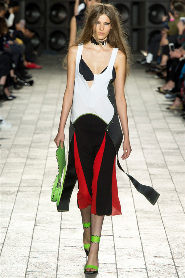 范思哲旗下副牌 Versus Versace(范瑟丝)于伦敦时装周发布2018春夏系列时装秀,以纽约90年代的独特风格作为这一系列的灵感来源。模特们往来穿梭于秀场中,与锐利先锋之姿展示出品牌“青春、性感、个性、有趣”的灵魂。本季系列设计师大量运用格纹,街头风的网眼元素,运动范儿十足的连衣裙,融入了夸张明亮的撞色,使整场秀更加酷帅又年轻。