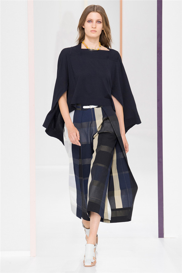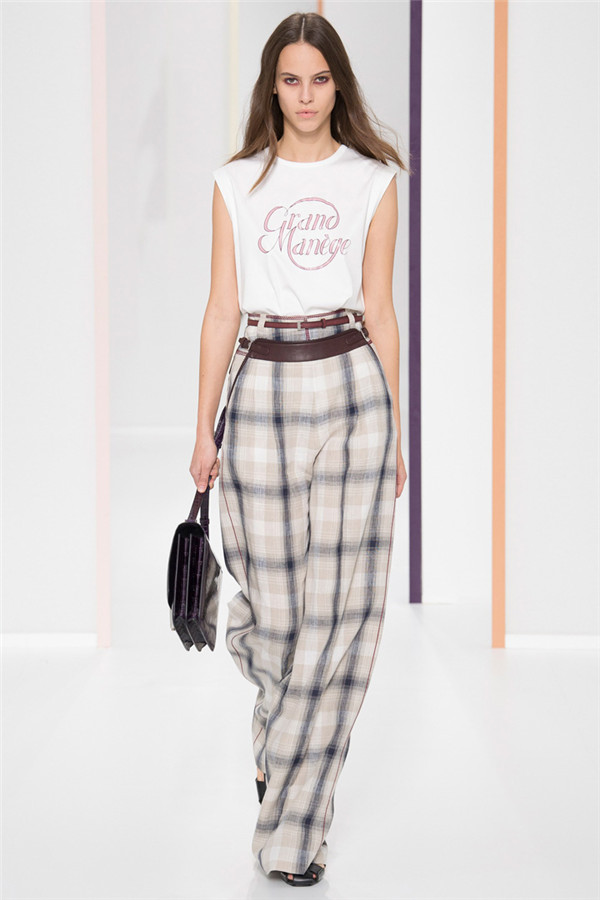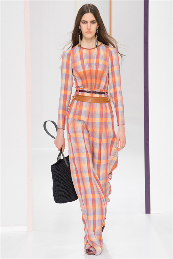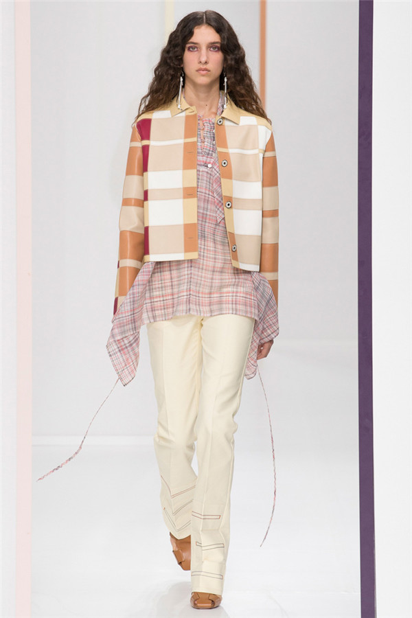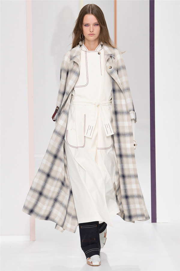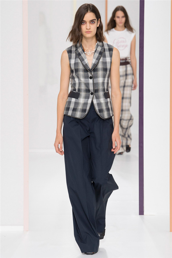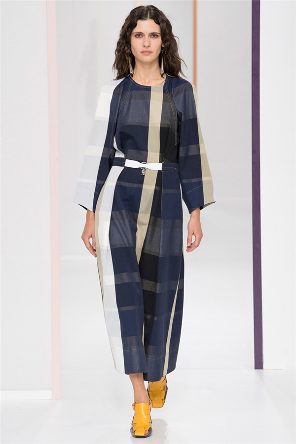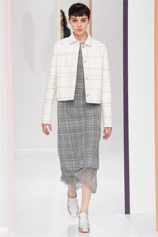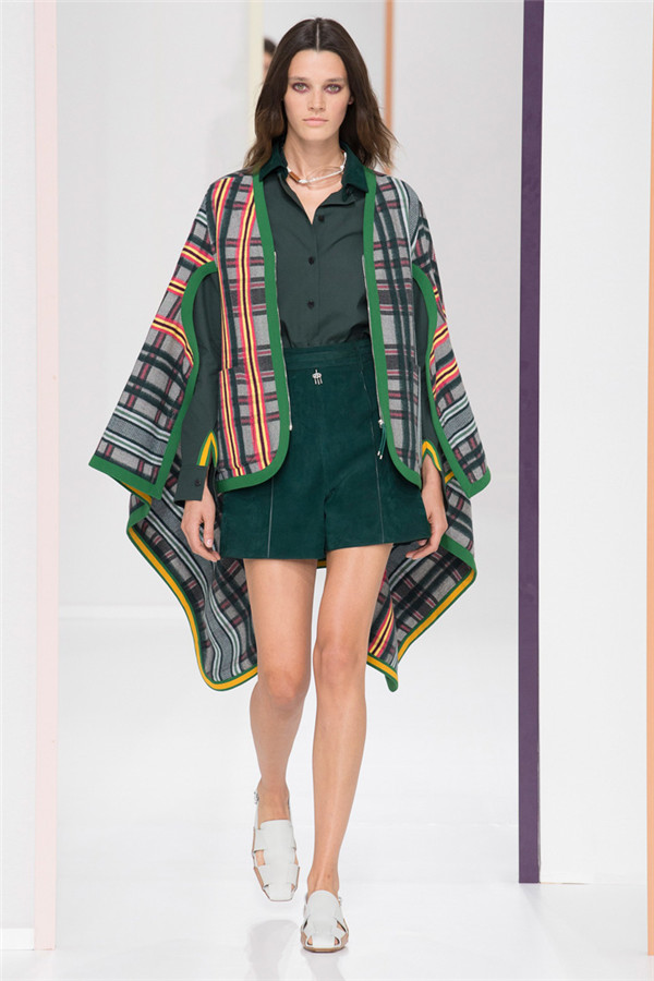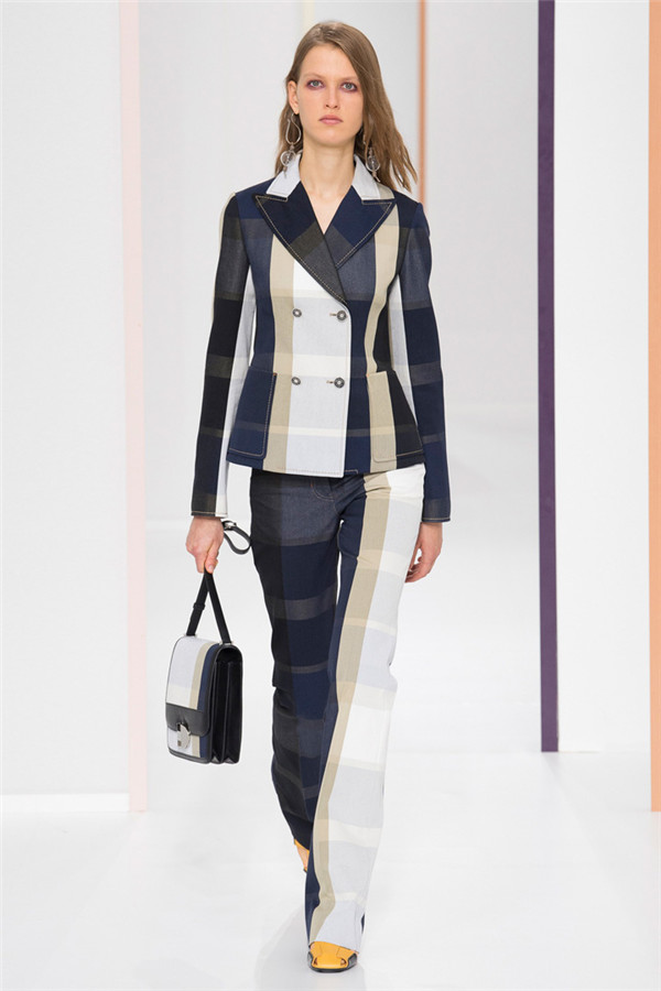 第一套作品是绿色格子呢的马毯斗篷,搭配了深绿色府绸衬衫,以及正绒面小牛皮革制作的高腰短裤。接下来出场的是五十套各种各样的服装,大多是纤细修长的西装裤装、外套和紧身的半长裙。格纹元素不断出现,演绎了各种花样,既有蓝色西装上的野餐毯格纹,也有黑白褶裥T恤上的马德拉斯格纹。