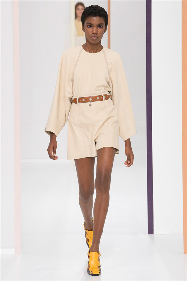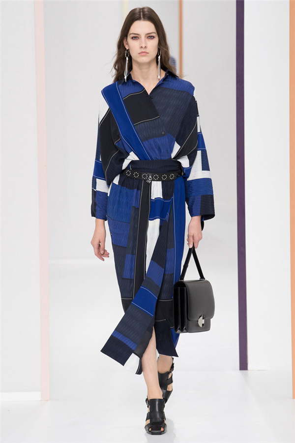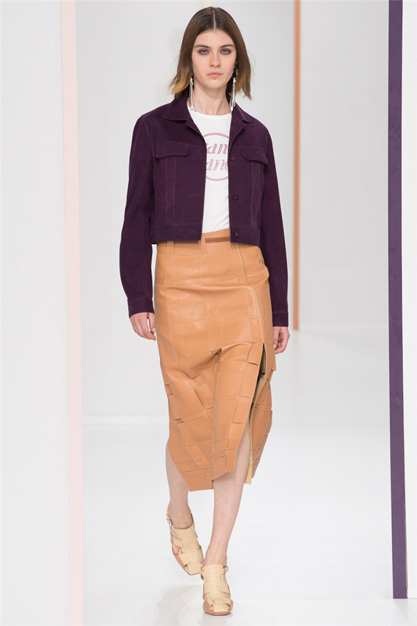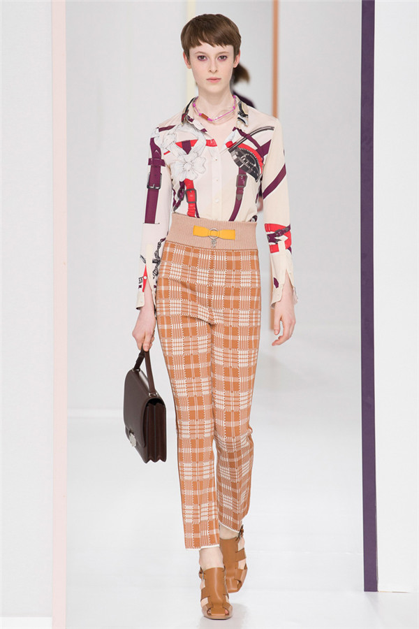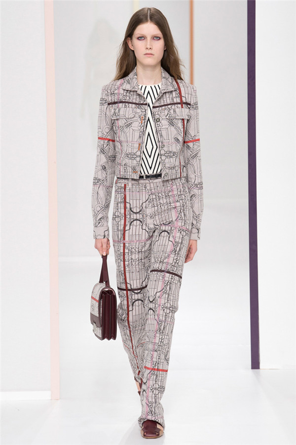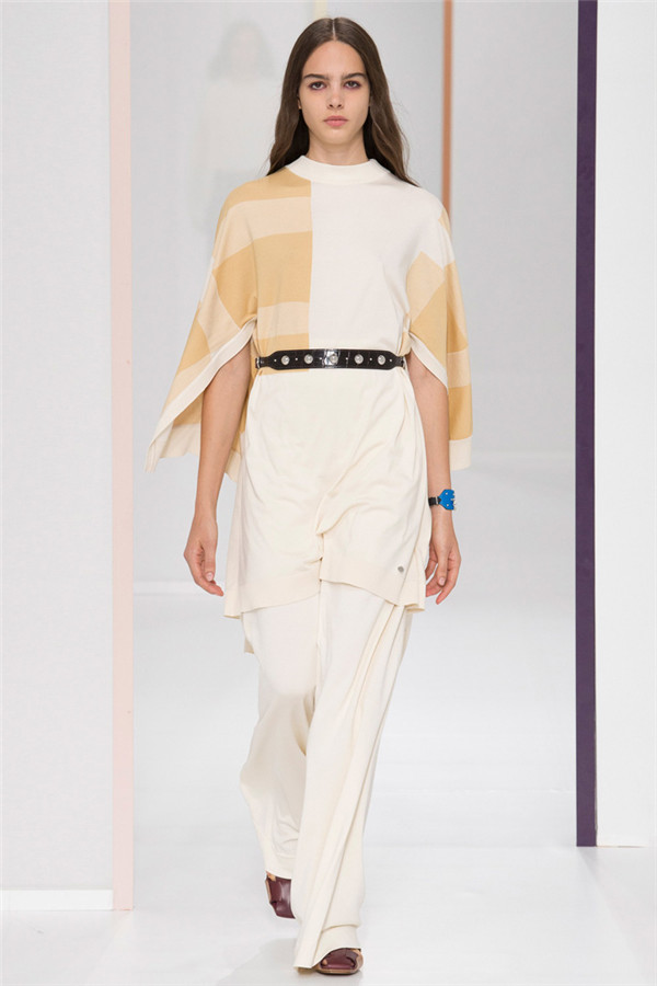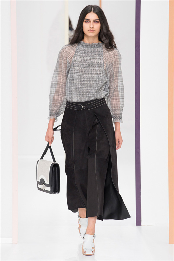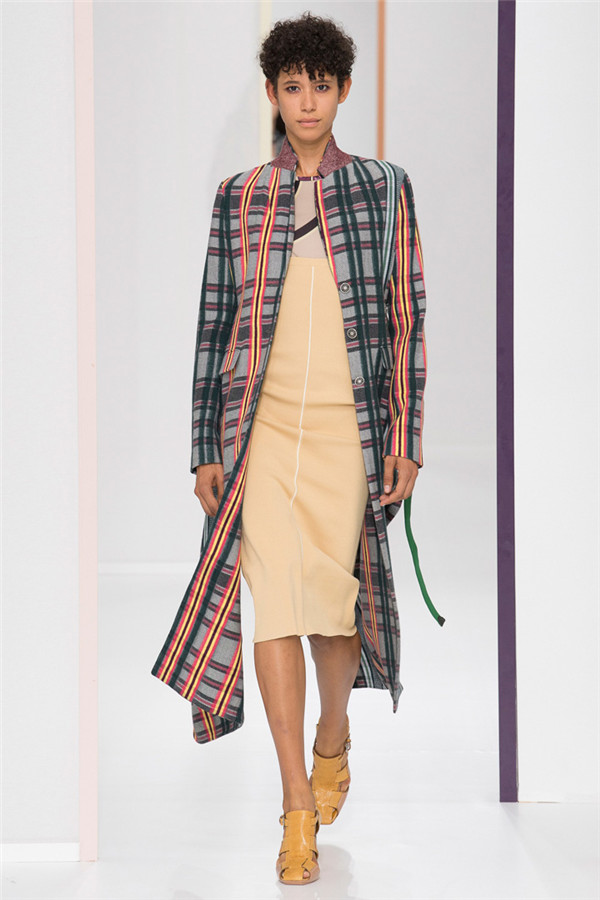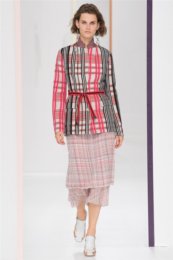 第一套作品是绿色格子呢的马毯斗篷,搭配了深绿色府绸衬衫,以及正绒面小牛皮革制作的高腰短裤。接下来出场的是五十套各种各样的服装,大多是纤细修长的西装裤装、外套和紧身的半长裙。格纹元素不断出现,演绎了各种花样,既有蓝色西装上的野餐毯格纹,也有黑白褶裥T恤上的马德拉斯格纹。