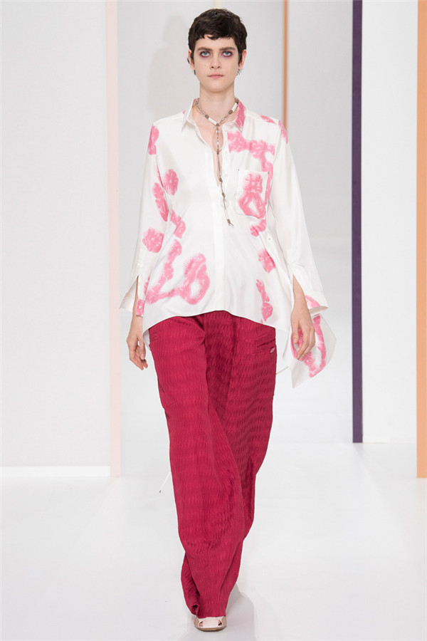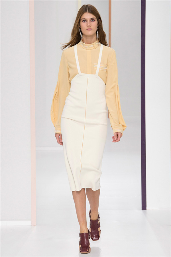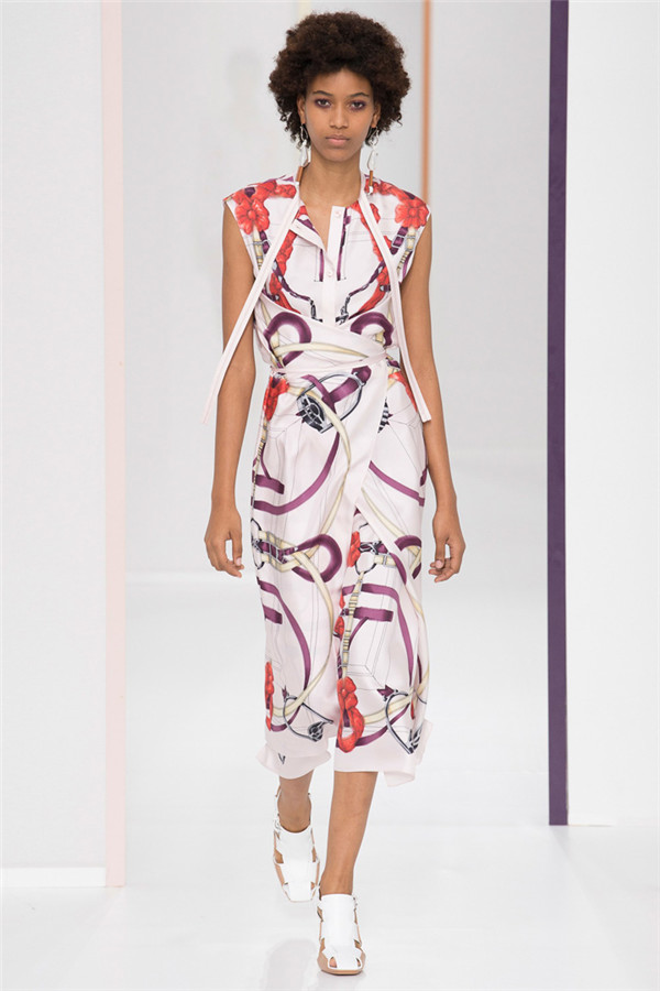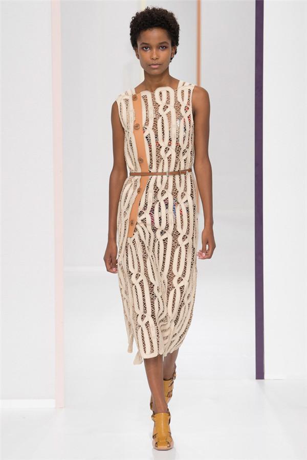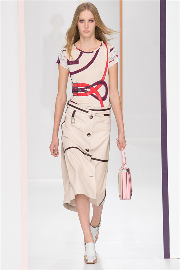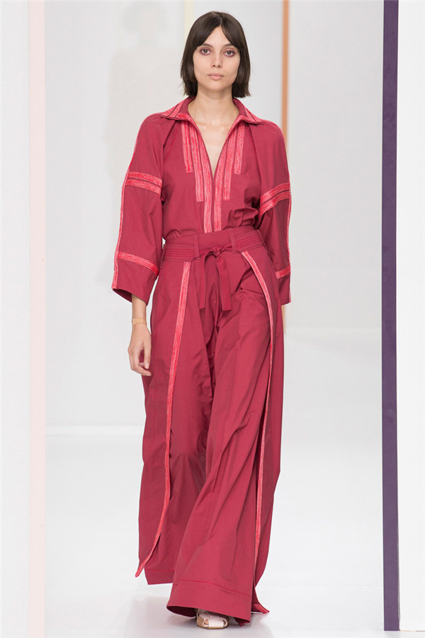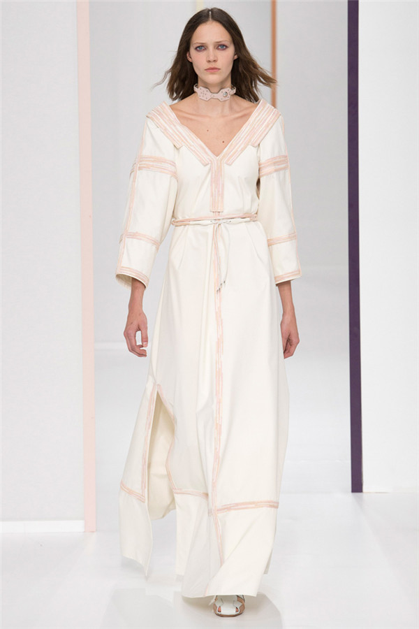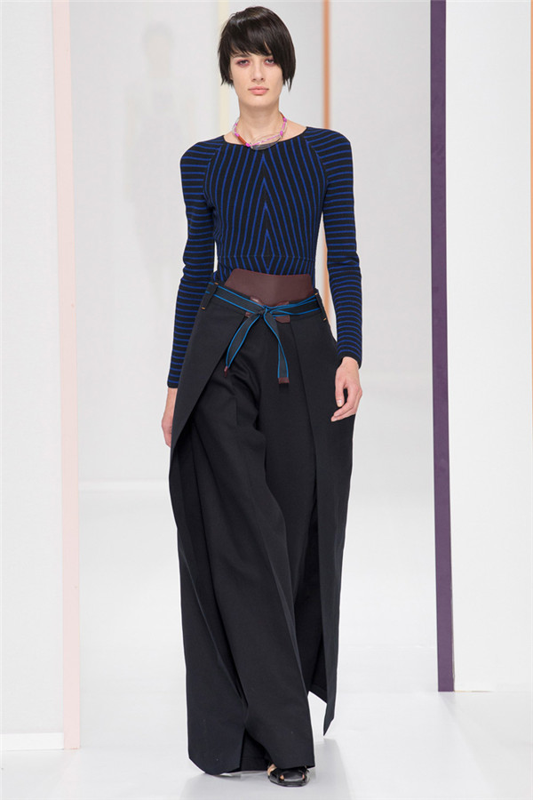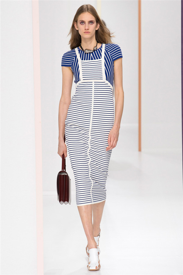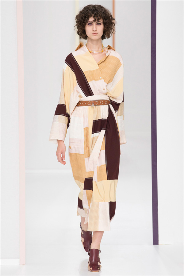 第一套作品是绿色格子呢的马毯斗篷,搭配了深绿色府绸衬衫,以及正绒面小牛皮革制作的高腰短裤。接下来出场的是五十套各种各样的服装,大多是纤细修长的西装裤装、外套和紧身的半长裙。格纹元素不断出现,演绎了各种花样,既有蓝色西装上的野餐毯格纹,也有黑白褶裥T恤上的马德拉斯格纹。