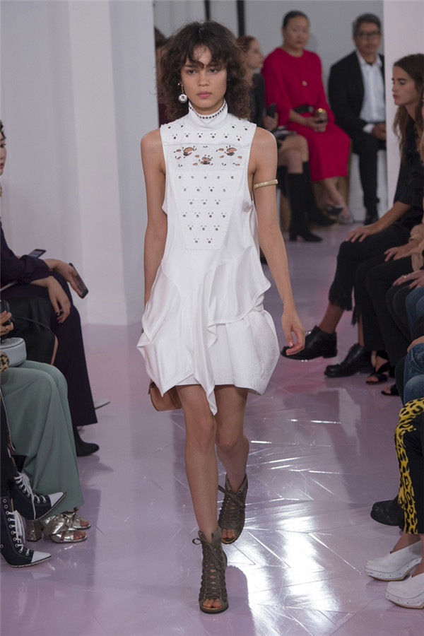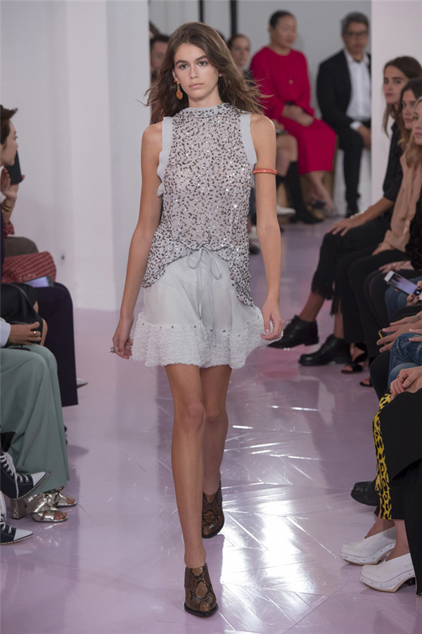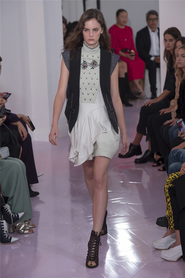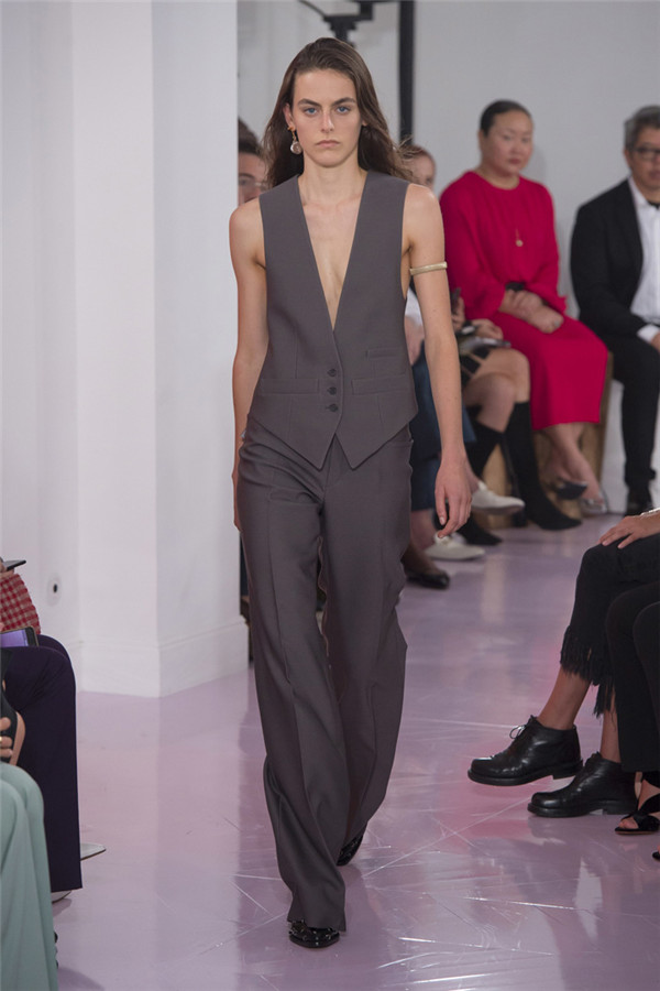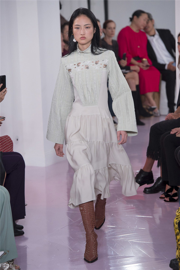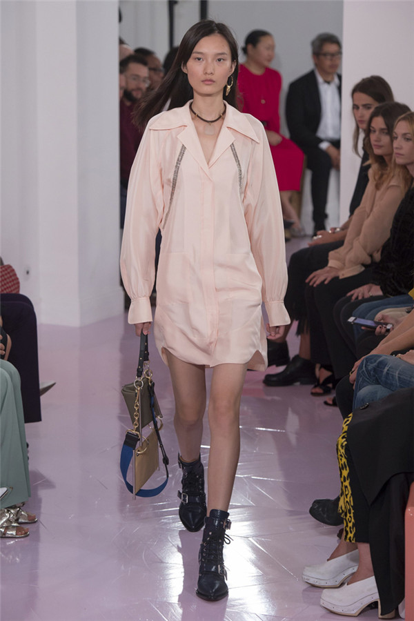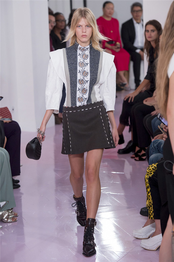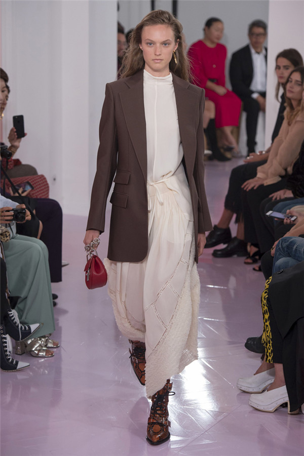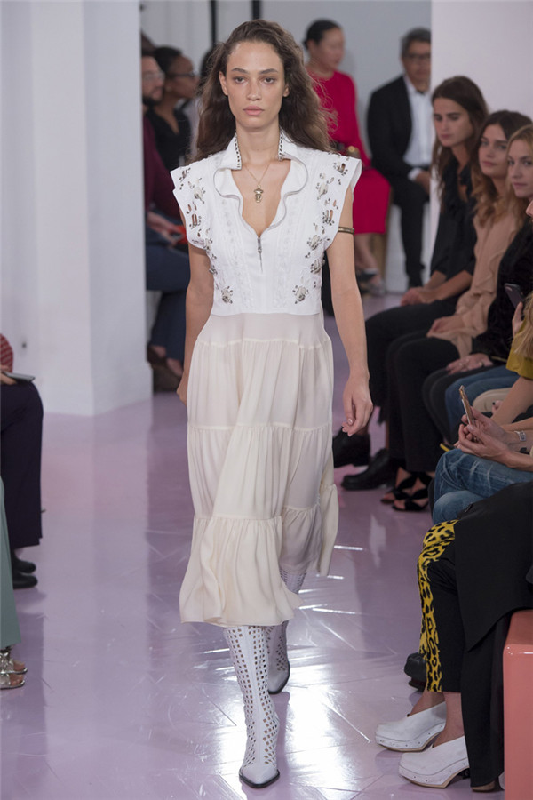 本系列看起来就像Ramsay-Levi本人,像她给巴黎时装界长期以来留下的形象一样,强大扎实。值得一提的是,定制皮外套和缝着“Os”的紧身七分牛仔裤体现了该系列与Chloé近期系列的梦幻般波希米亚风格相对比,有了180度大转变。但这样的转变与我们所处的时代非常一致。别的还有一些年轻女性会迫不及待为自己攒钱买的能显示身份的作品:例如有着刺绣围裙、适合外出的丝质运动上衣,胸衣带环的淡蓝色亚麻草原连衣裙,还有那些像骑马服一样的天鹅绒作品。