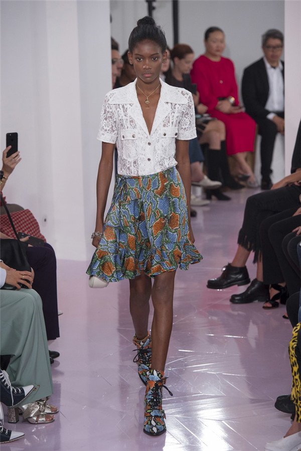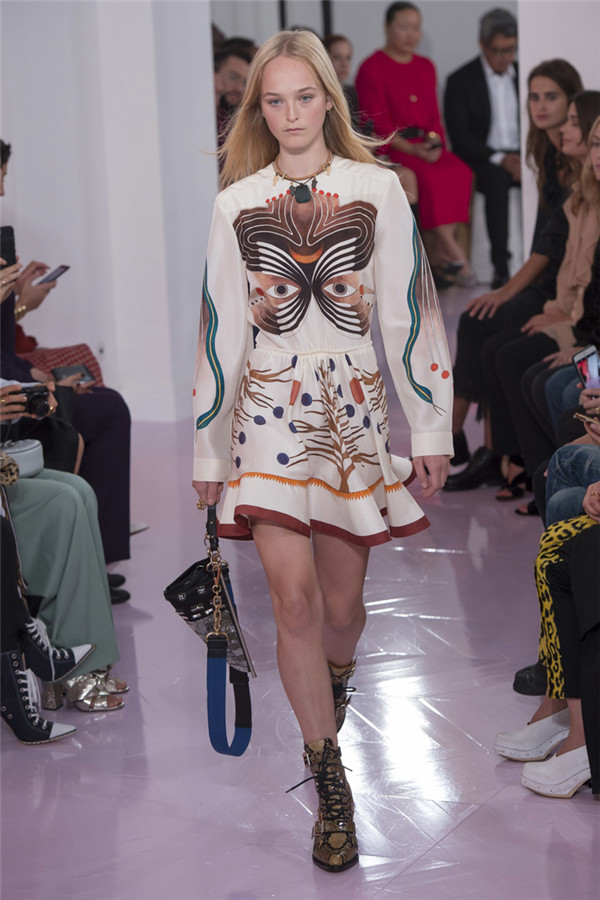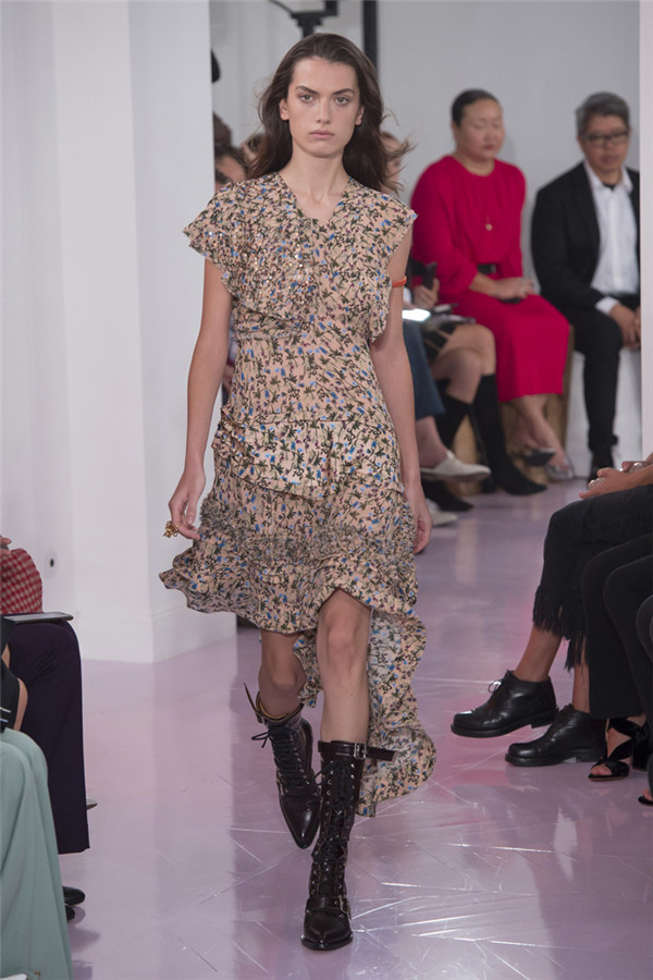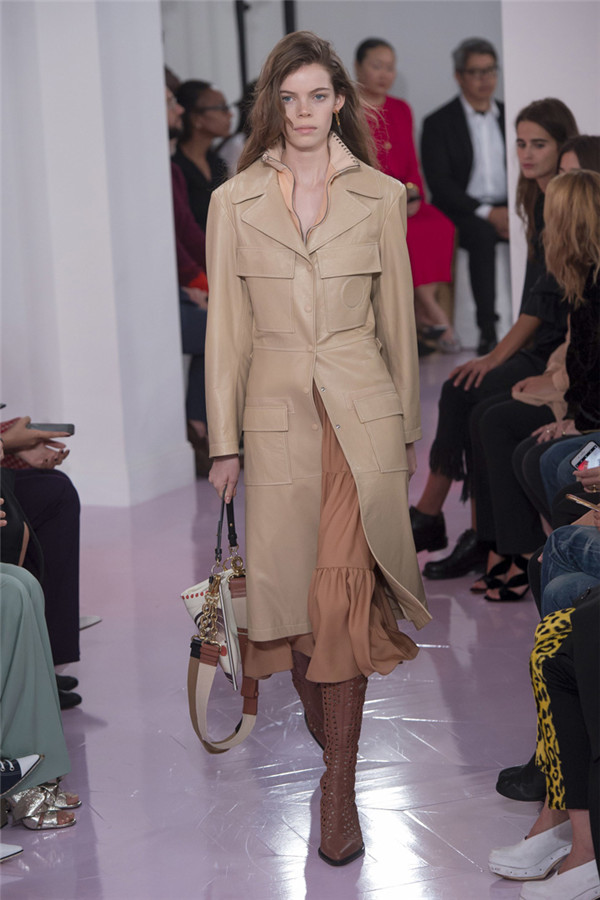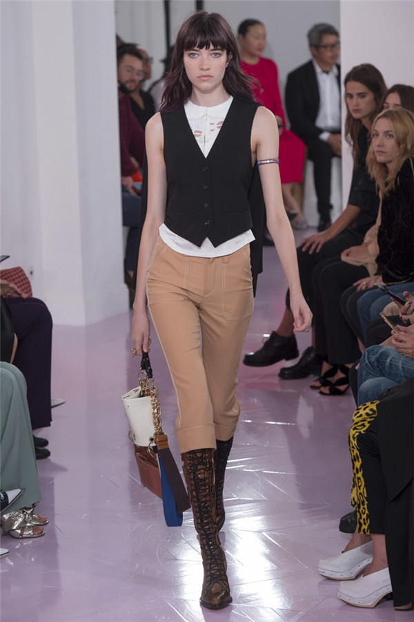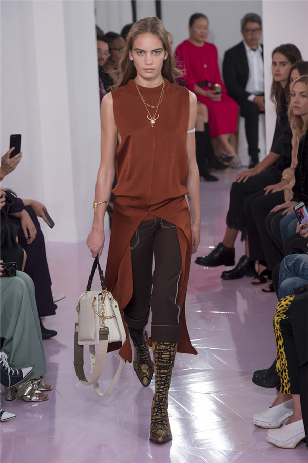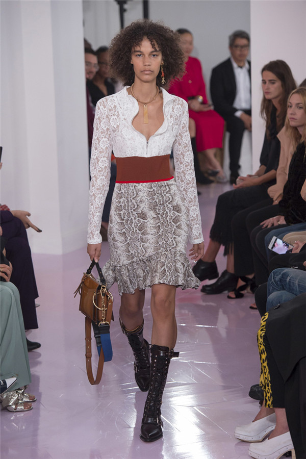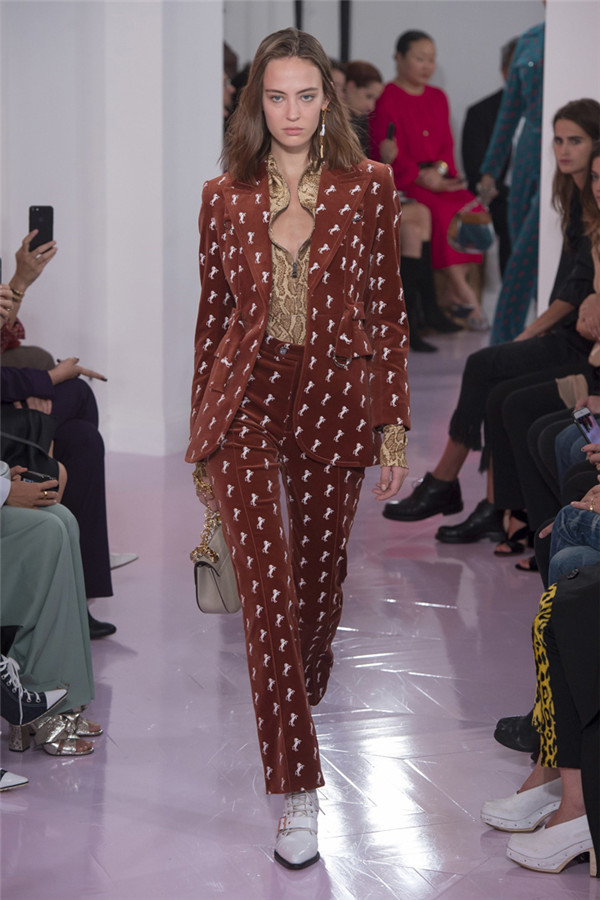 藤格纹皮靴、蟒蛇纹中短靴以及有很多带子的“反It”包,有了它们,该系列更加让人满意。 Ramsay-Levi通过纵观该品牌的历史、从她所有前任设计师的作品那里稍微借鉴一下来打造作品。从Lagerfeld身上,她想到了彩绘连衣裙,只是她的连衣裙采用的是清新棉布,而不是丝绸,而且绘有像眼睛和手这样的吉祥符号。McCartney和Philo都喜欢马,而Ramsay-Levi的马图案则是绣在天鹅绒上。
