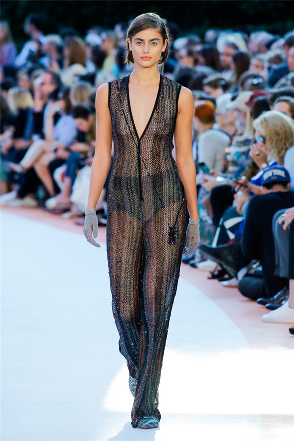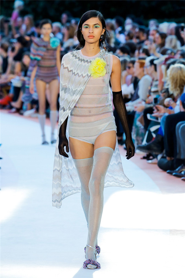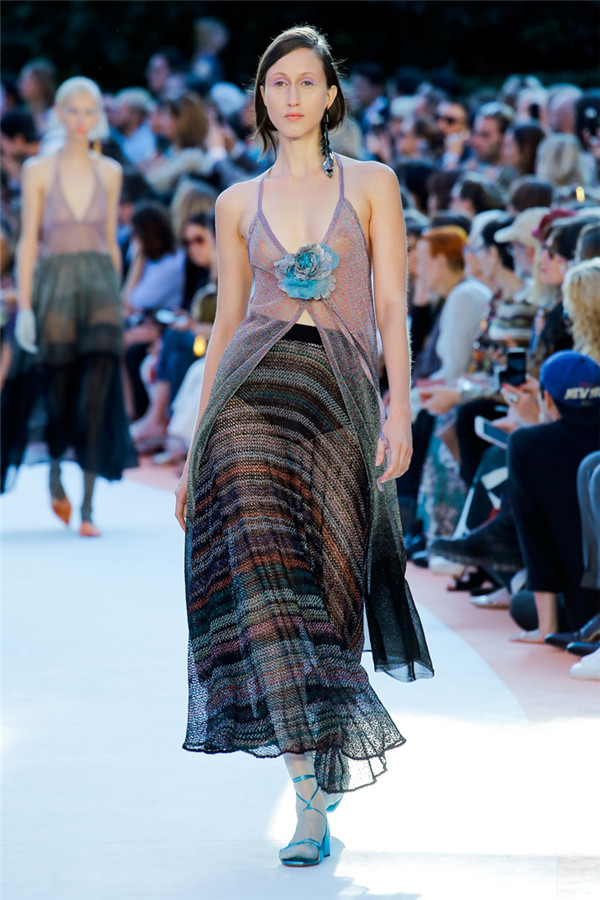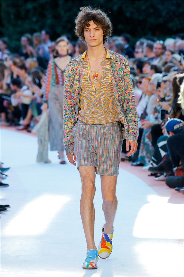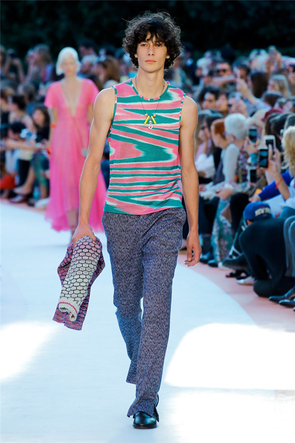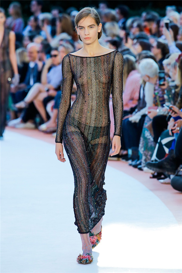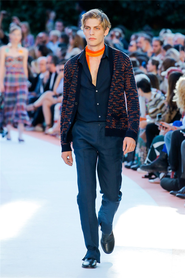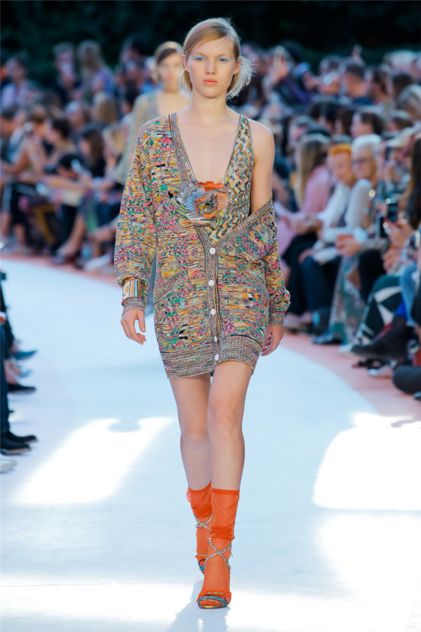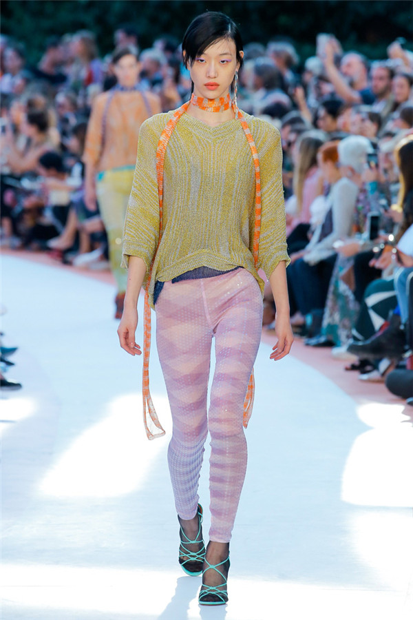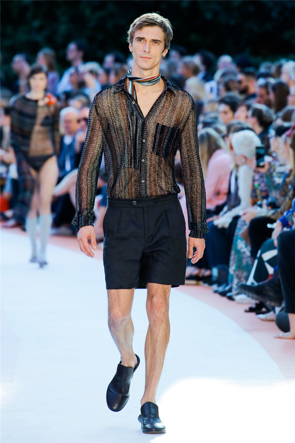 本季注重的是透明连衣裙、显腿长的服装形状以及闪光的金银丝线。本季的造型非常裸露,比起米兰的派对,可能更适合出现在伊比沙岛的派对上,因为在伊比沙岛的派对上没人会对透明的针织紧身连身衣裤、相配套斗篷感到惊讶,在那里,不穿裤子可能也并不少见。今天有个特点,那就是越结实的针织服装越好。有些服装中有种幽默感,包括那件合身开襟羊毛衫和打底裤组合而成的服装以及有着笑脸图案的白底黑线提花针织服装,而彩色肖像图案让厚重的毛衣有了收藏价值。那件上面反反复复出现多色小丑图案的裙式大衣上也很好看。
