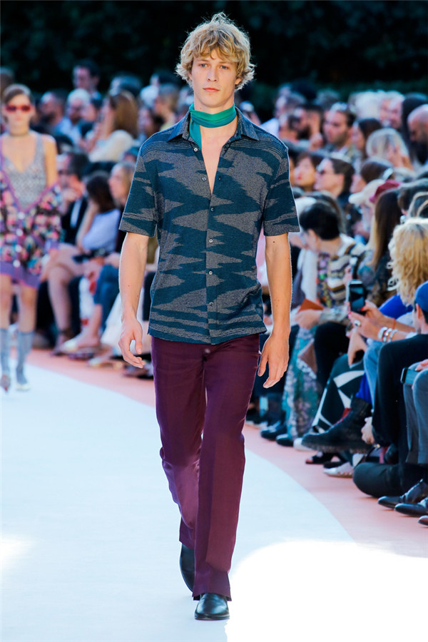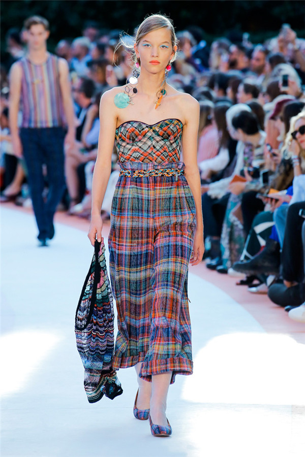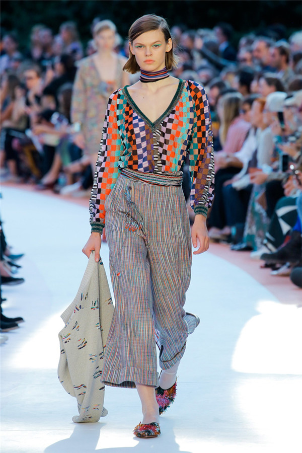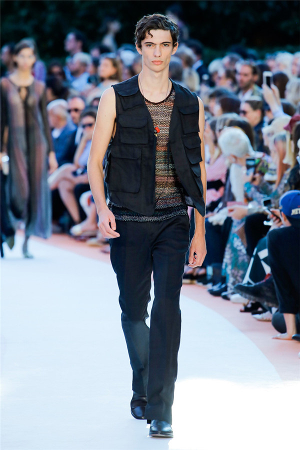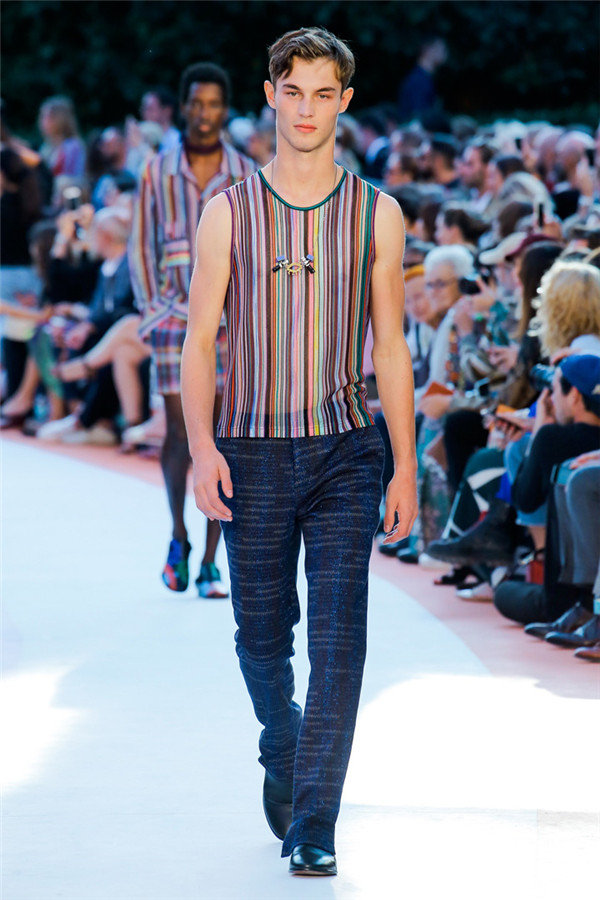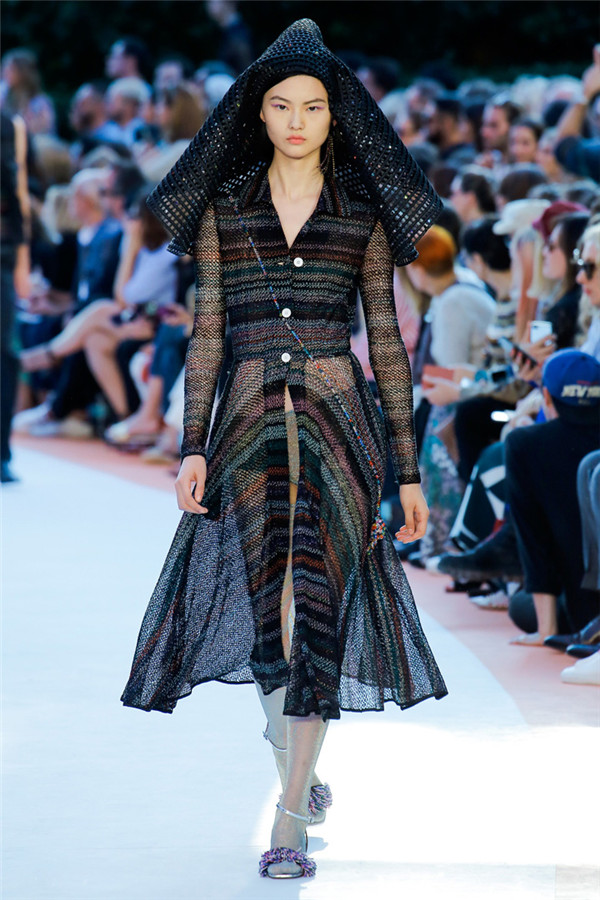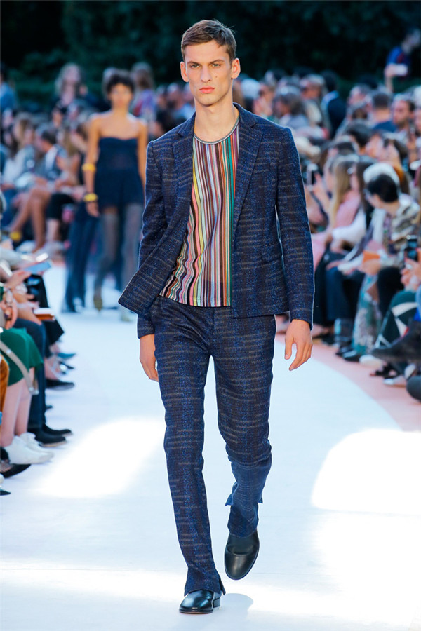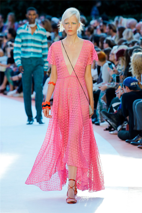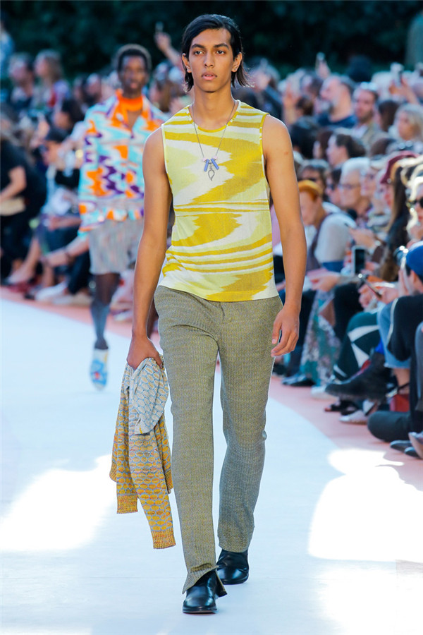 本季注重的是透明连衣裙、显腿长的服装形状以及闪光的金银丝线。本季的造型非常裸露,比起米兰的派对,可能更适合出现在伊比沙岛的派对上,因为在伊比沙岛的派对上没人会对透明的针织紧身连身衣裤、相配套斗篷感到惊讶,在那里,不穿裤子可能也并不少见。今天有个特点,那就是越结实的针织服装越好。有些服装中有种幽默感,包括那件合身开襟羊毛衫和打底裤组合而成的服装以及有着笑脸图案的白底黑线提花针织服装,而彩色肖像图案让厚重的毛衣有了收藏价值。那件上面反反复复出现多色小丑图案的裙式大衣上也很好看。