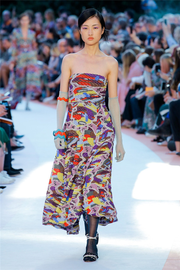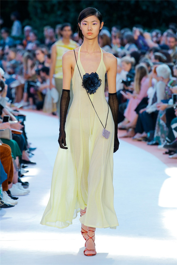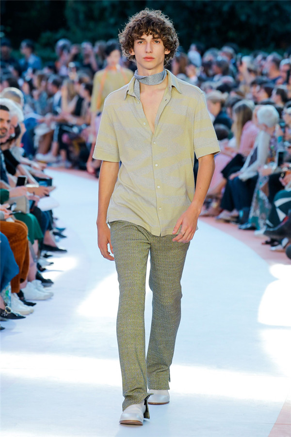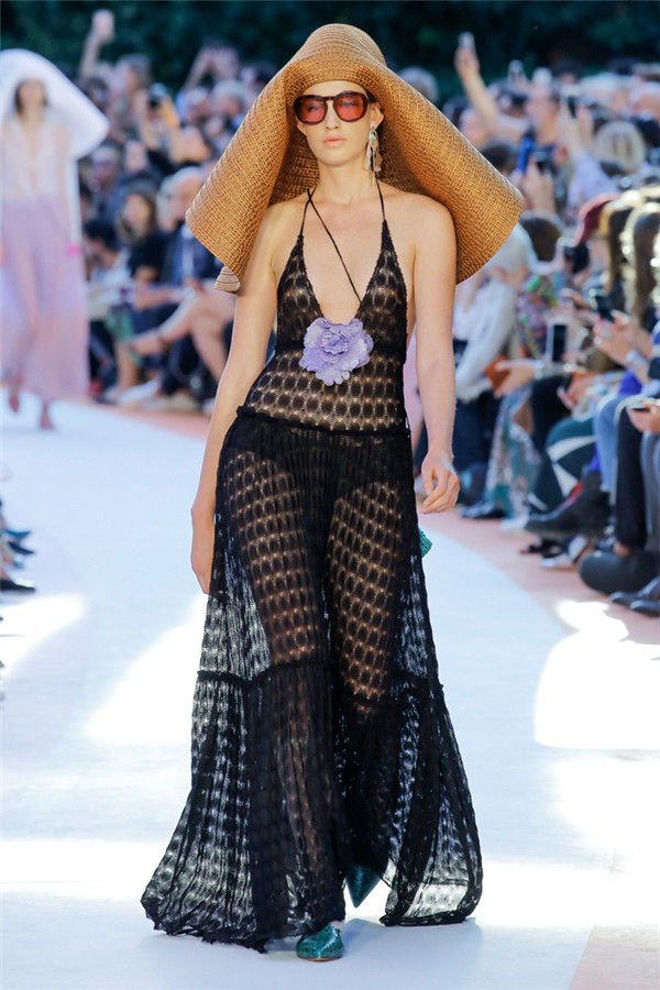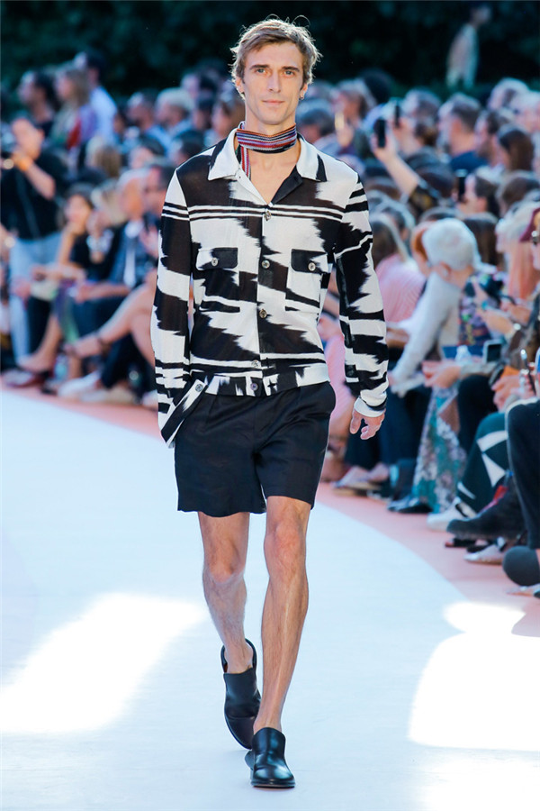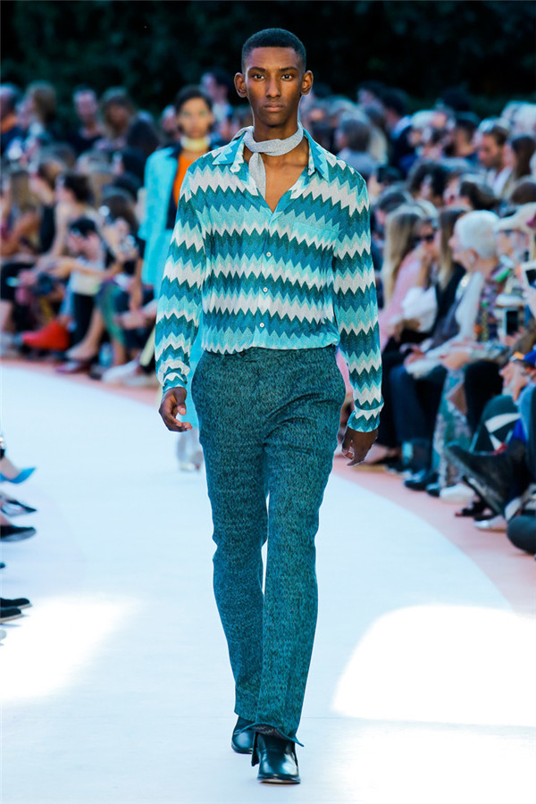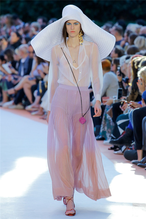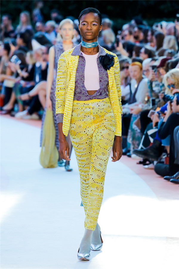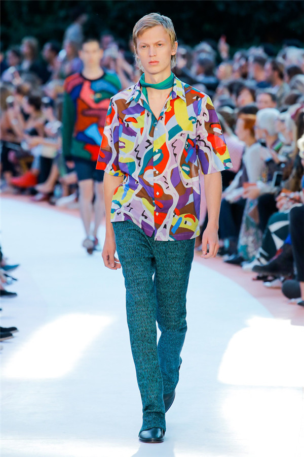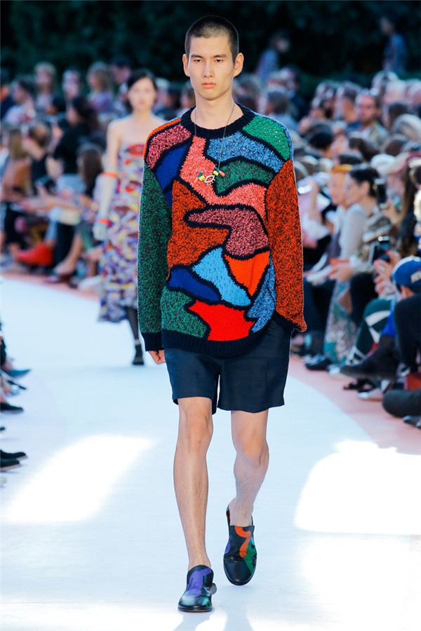 本季注重的是透明连衣裙、显腿长的服装形状以及闪光的金银丝线。本季的造型非常裸露,比起米兰的派对,可能更适合出现在伊比沙岛的派对上,因为在伊比沙岛的派对上没人会对透明的针织紧身连身衣裤、相配套斗篷感到惊讶,在那里,不穿裤子可能也并不少见。今天有个特点,那就是越结实的针织服装越好。有些服装中有种幽默感,包括那件合身开襟羊毛衫和打底裤组合而成的服装以及有着笑脸图案的白底黑线提花针织服装,而彩色肖像图案让厚重的毛衣有了收藏价值。那件上面反反复复出现多色小丑图案的裙式大衣上也很好看。