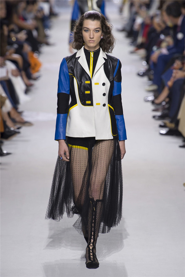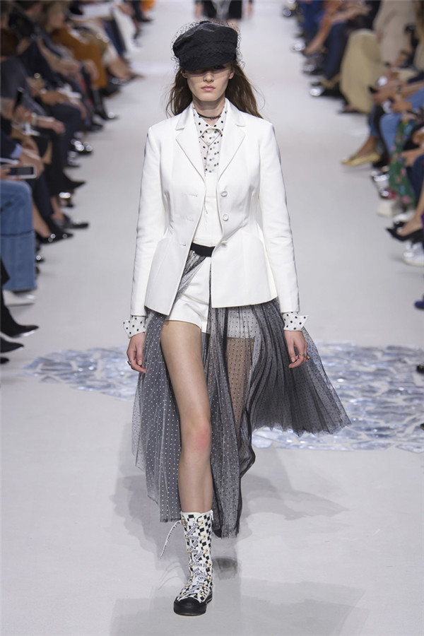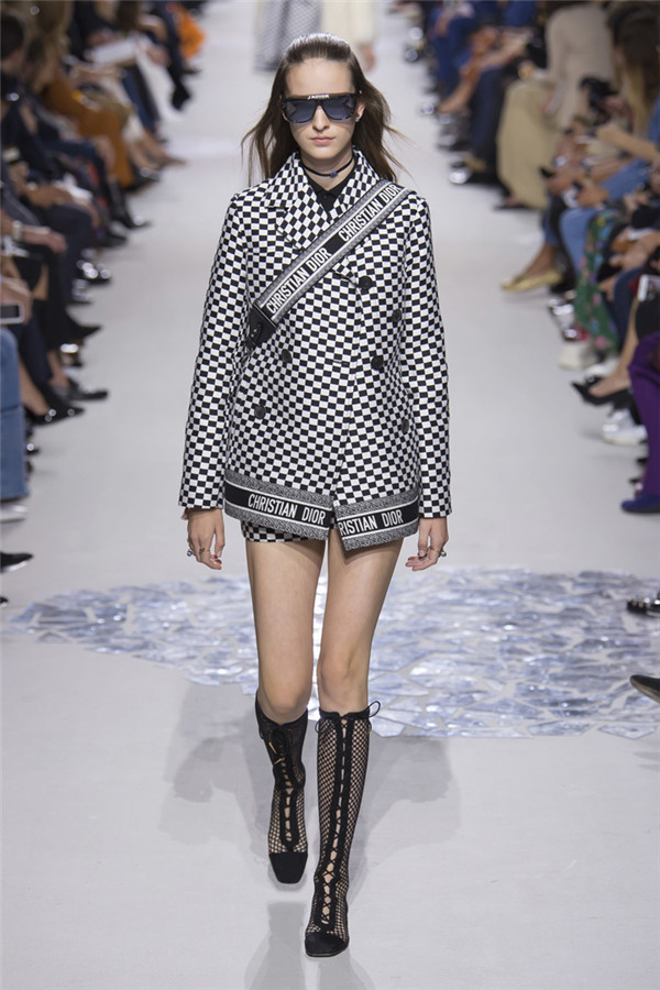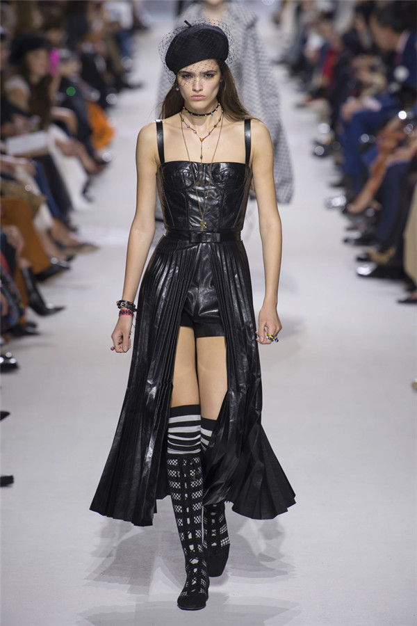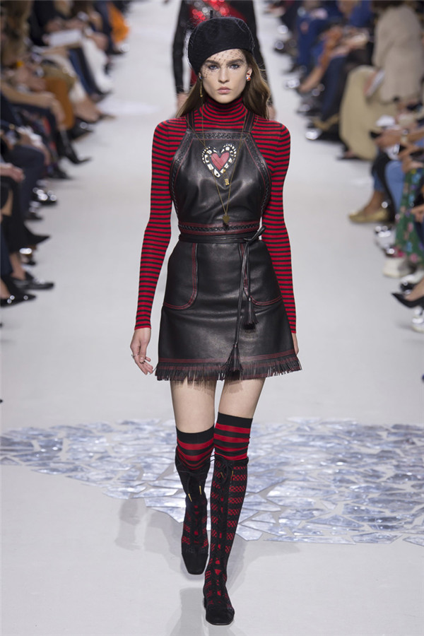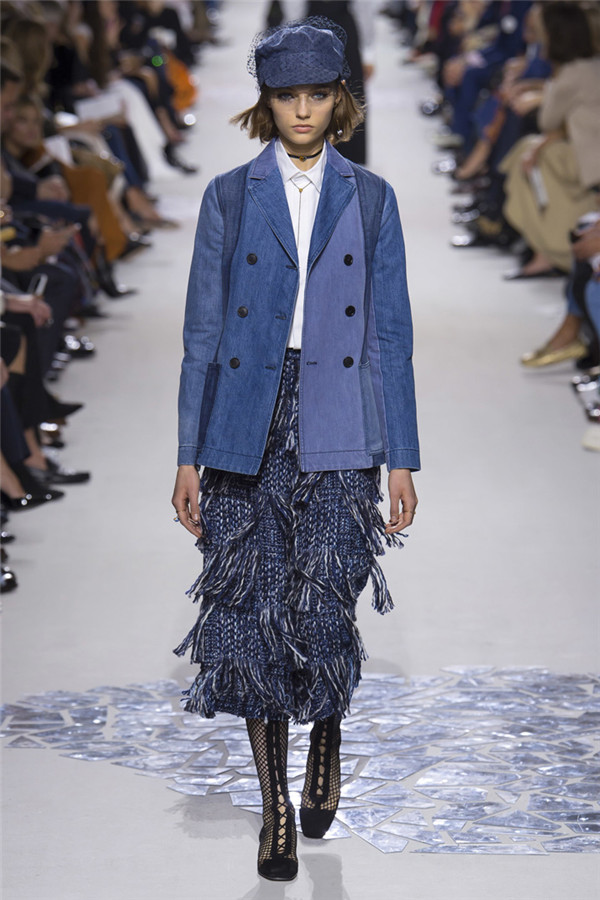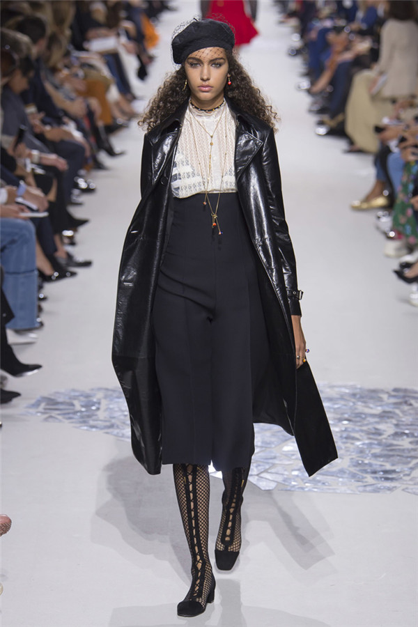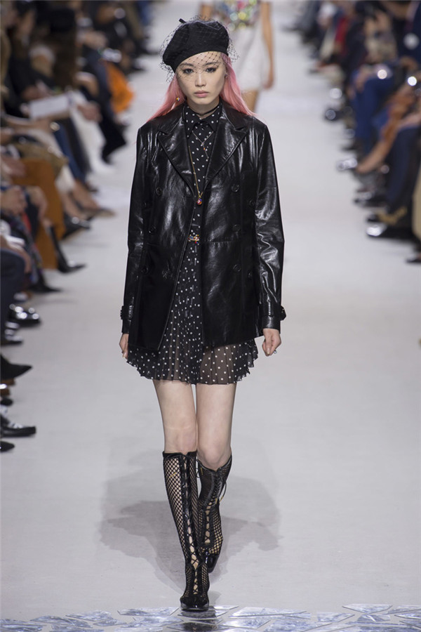 本季还应用了Dior 60到80年代末创意总监Marc Bohan常用的布莱顿条纹、波尔卡圆点、格子图案。在材质的应用上,依旧沿用前几季的纱质面料之外,还应用了不少皮革和丹宁。皮革款式的设计包括皮革大衣、套装、皮革裙、拼接外套等多种款式,彰显强势、利落的女权风。丹宁材质的拼接外套、裤子以及流苏丹宁外套则呈现出一种复古、做旧的特色,搭配Dior的贝雷帽,彰显十足的复古风情。