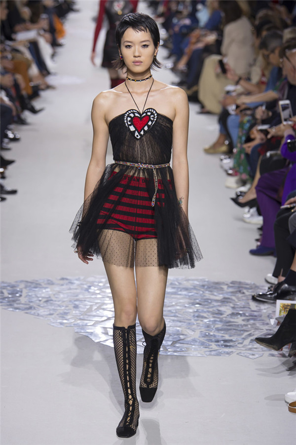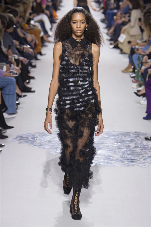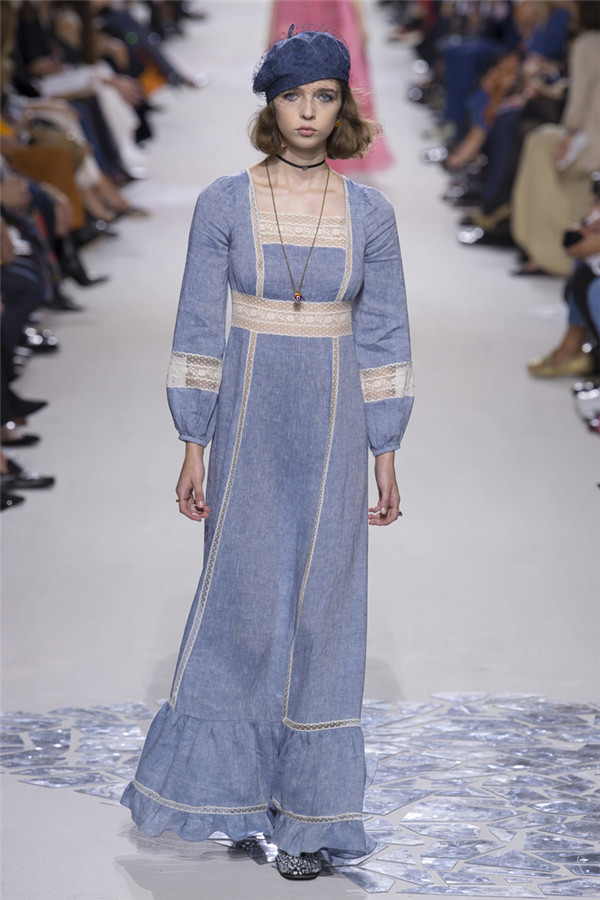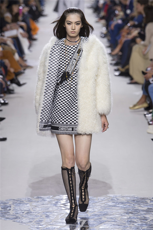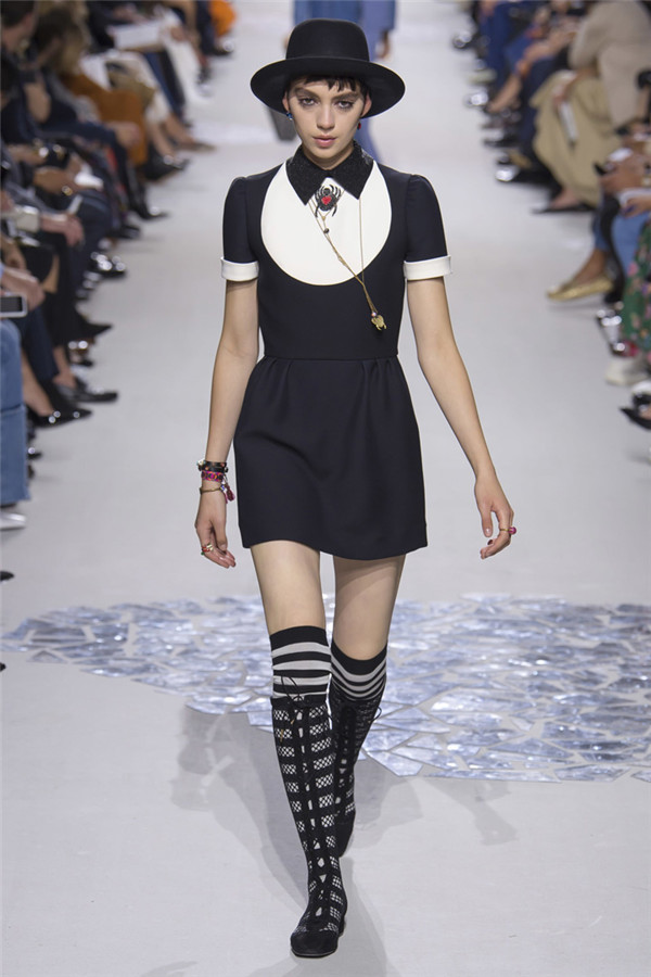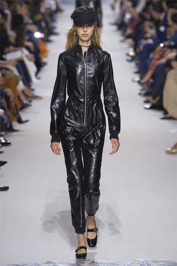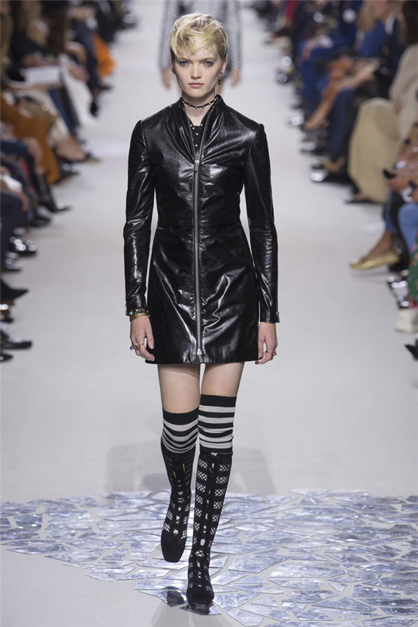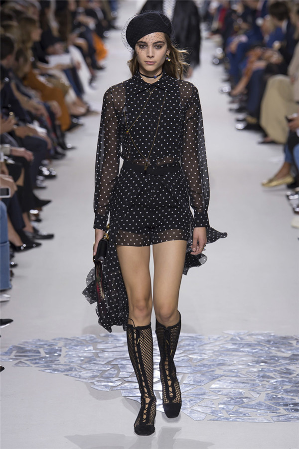 本季还应用了Dior 60到80年代末创意总监Marc Bohan常用的布莱顿条纹、波尔卡圆点、格子图案。在材质的应用上,依旧沿用前几季的纱质面料之外,还应用了不少皮革和丹宁。皮革款式的设计包括皮革大衣、套装、皮革裙、拼接外套等多种款式,彰显强势、利落的女权风。丹宁材质的拼接外套、裤子以及流苏丹宁外套则呈现出一种复古、做旧的特色,搭配Dior的贝雷帽,彰显十足的复古风情。