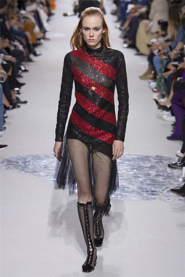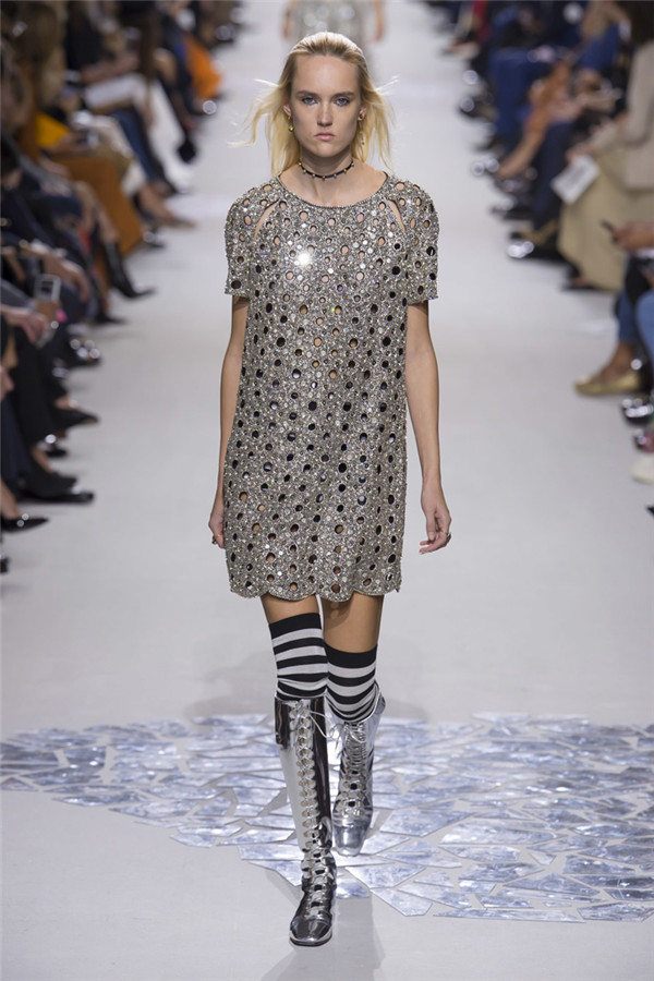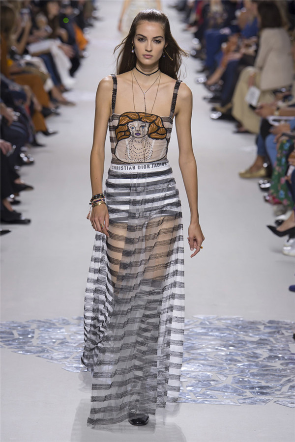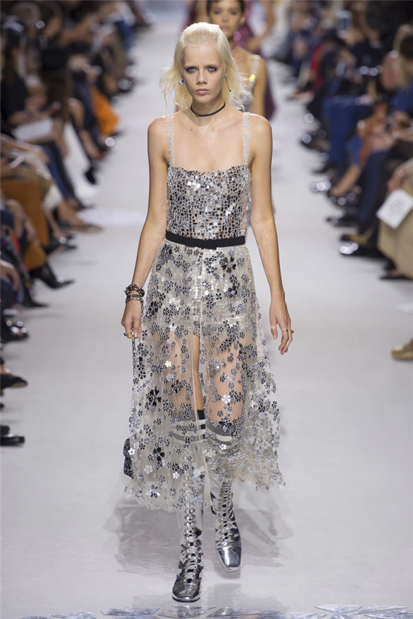 受女艺术家Niki de Saint Phalle的影响,本次Christian Dior 2018春夏系列成衣中也贡献出了大量与Jardin des Tarots息息相关的破碎式亮片装饰的服装款式,主要体现在裙装的设计上。在大秀压轴的几款裙装中,创意总监Maria Grazia Chiuri采用金黄、橘、蓝、暗红、紫红等五种不同色彩的相似款式来致敬Niki de Saint Phalle,透视的薄纱材质与亮片相结合,将现代迪斯科魅力通过女权主义艺术史的棱镜折射出来。