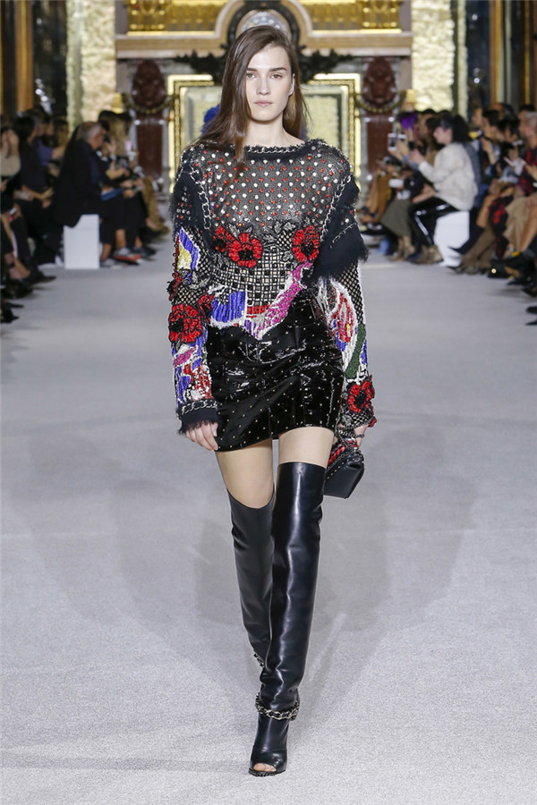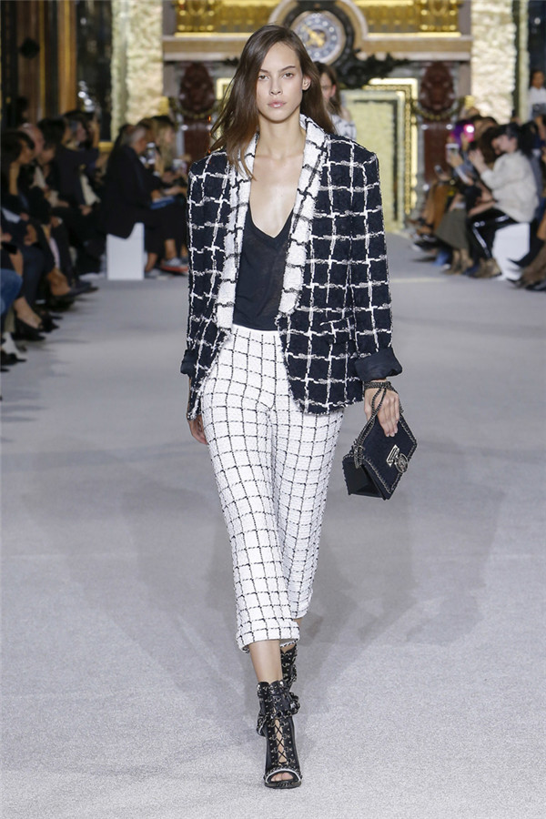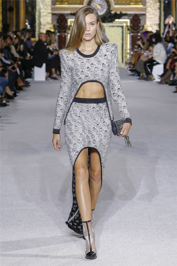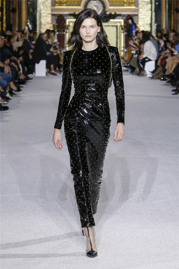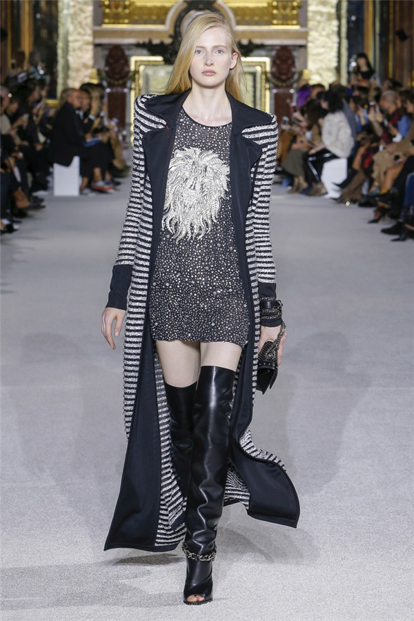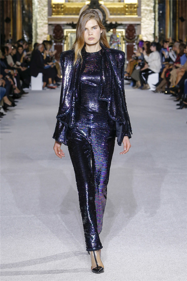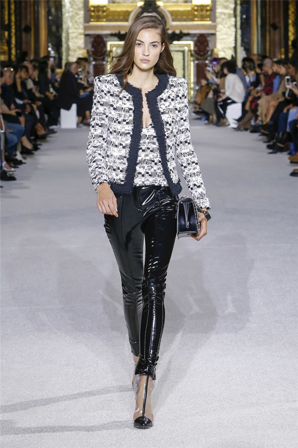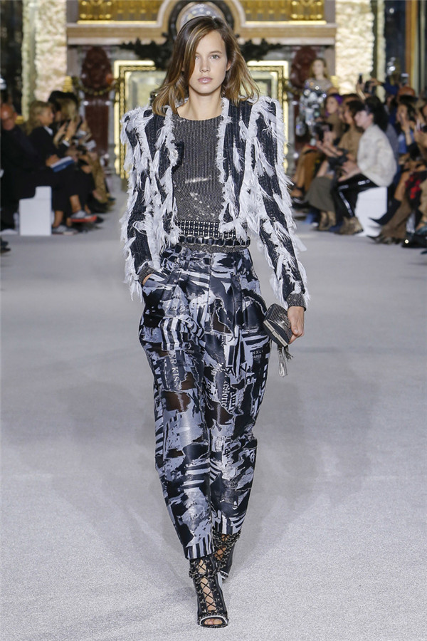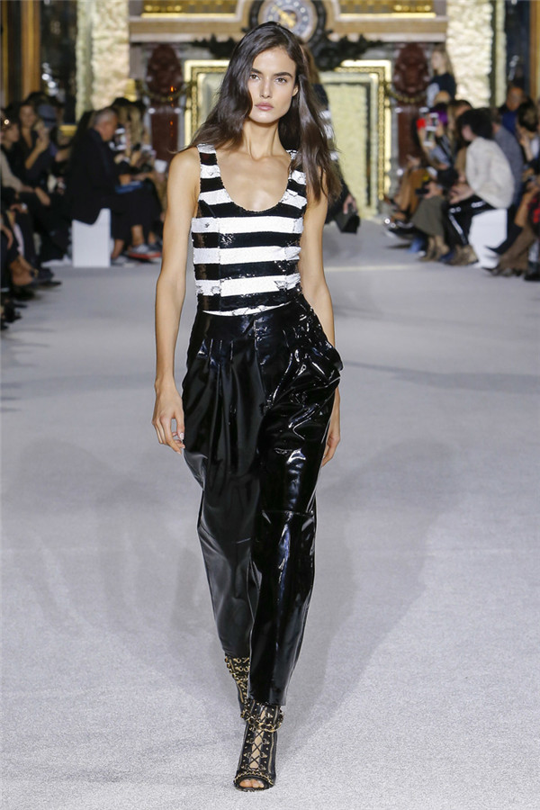 跟春夏季男装系列一样,通过单色亮片做成的Breton水兵服条纹和更柔软条纹来向法国致敬,这些柔软条纹同样是用亮片制成,有时会与磨破仿羔皮呢短裤搭配。这些短裤在Balmain的作品里并不常见,虽然属于日常穿着,但不是每天都能穿。本系列有特色的日常穿着还包括了V领几乎深到脚踝的毛衣、与镶金皮裤搭配的磨破露脐上衣和格子仿羔皮呢工装裤。