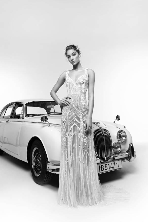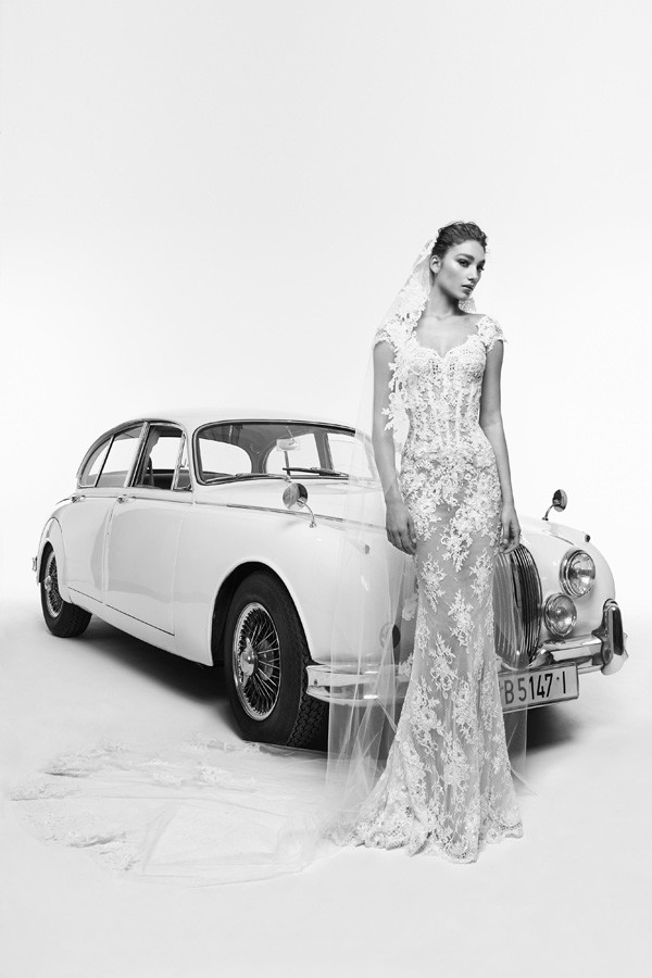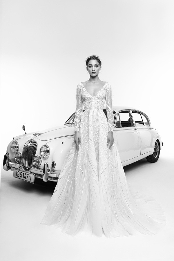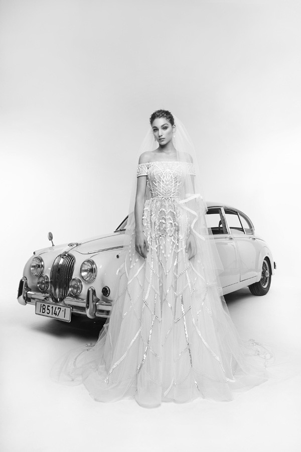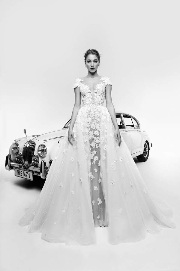 与此同时,Murad也并没有抛弃他那被广大女性所喜欢的花卉刺绣的造型。有线的花边以及裙子上的水晶装饰品,配合立体感十足的花卉刺绣在婚纱上绽放,并搭配上蕾丝贴花以及蝴蝶结腰带,让人惊艳不已。