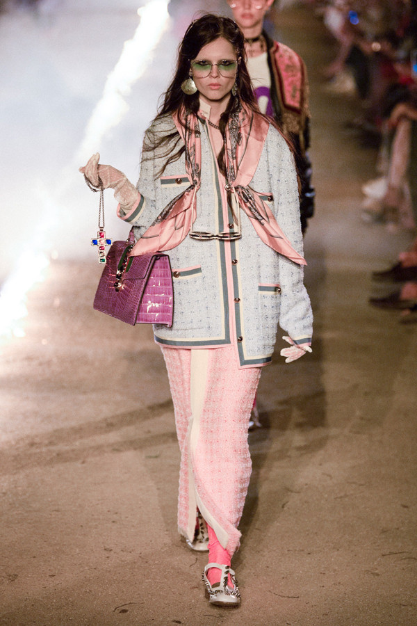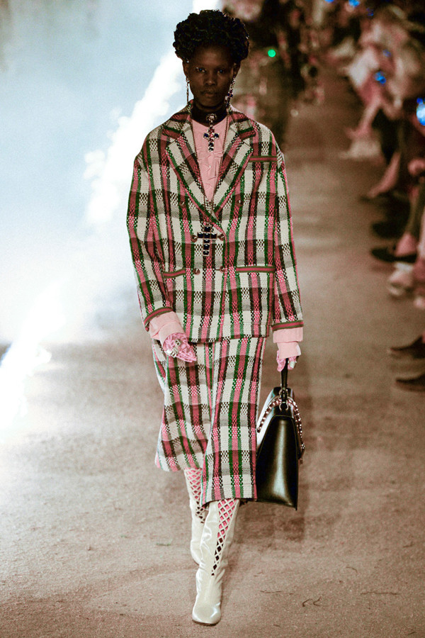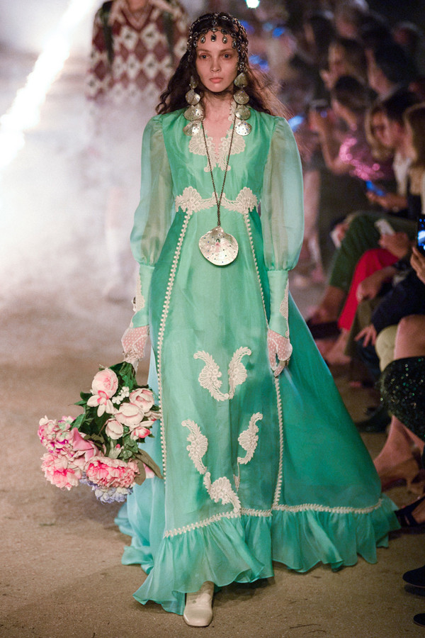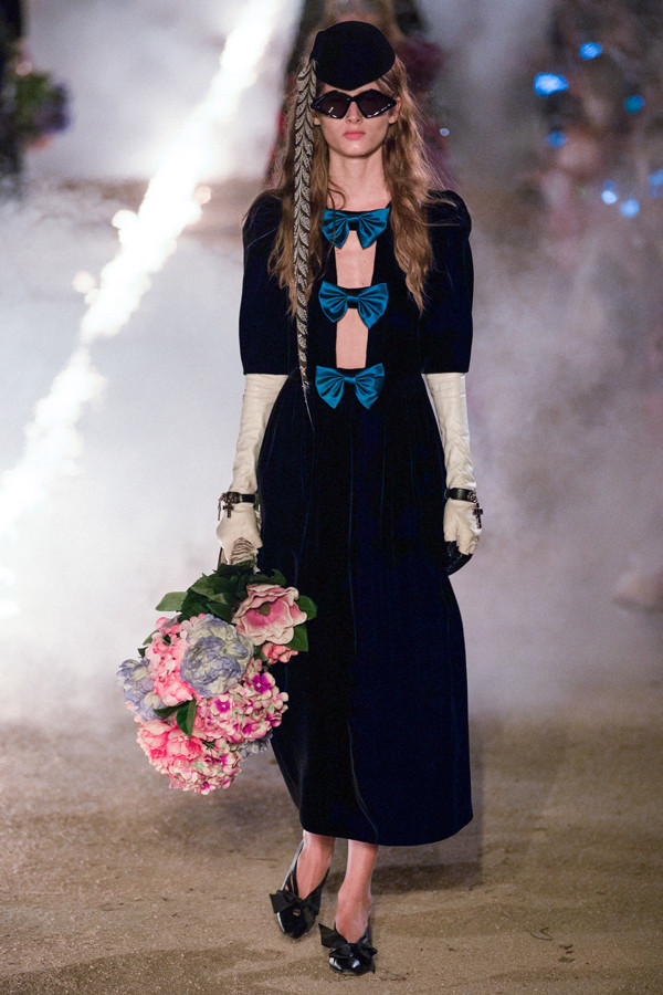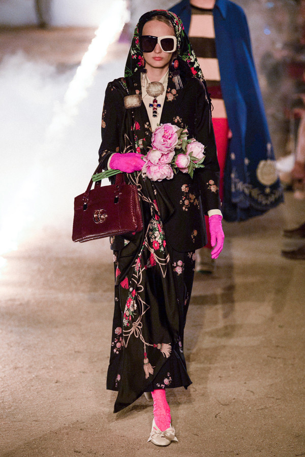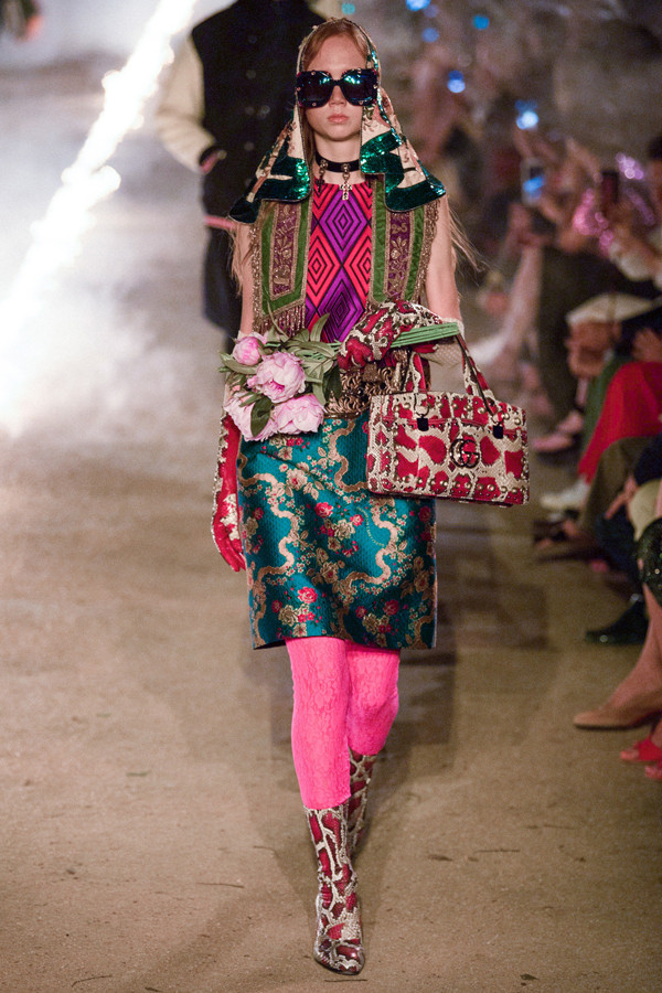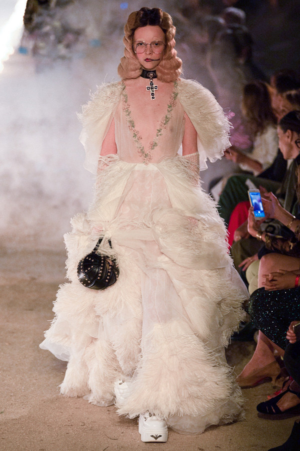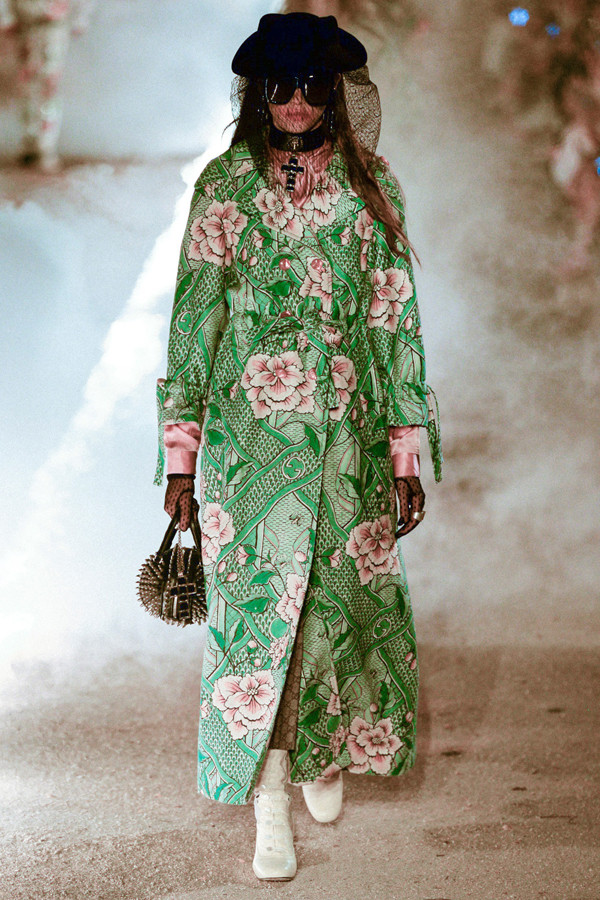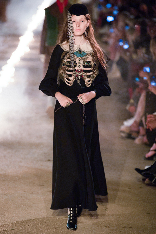 这次也有许多宗教的元素,比如象征着爱与救赎的十字架,始终贯穿了整个系列。再搭配GUCCI固有的元素,颜色跳脱的花卉、动物印花,以及柔情怀旧的百褶纱裙,设计师想表达的人与自然和谐的艺术美学,在这一次与宗教之间再次达到一种平衡与融合。装束酷似修女的模特神情肃穆,胸口部位佩戴着珠宝缠绕仿真肋骨的装饰,这很容易让人联想到15世纪的一种宗教习俗:在亡者尸骨上堆砌珍贵的珠宝,寓意着为对方创造一个华丽的来世,其中蕴含着生死循环的哲学。