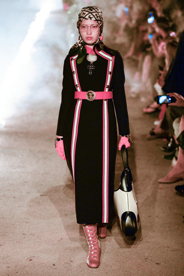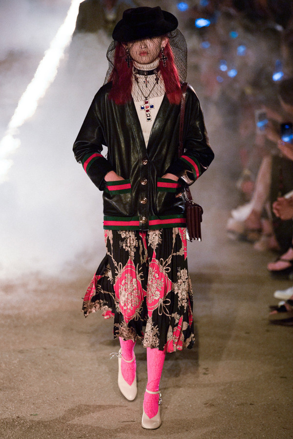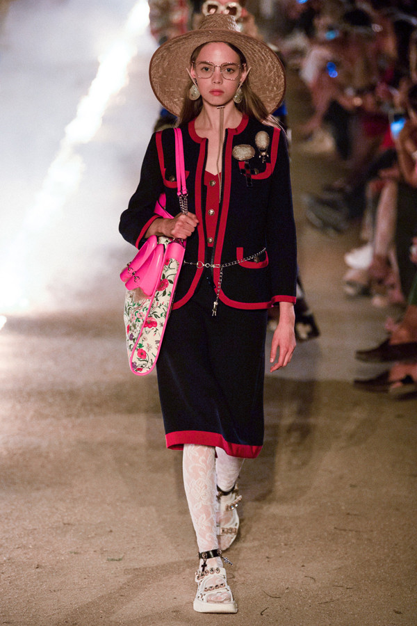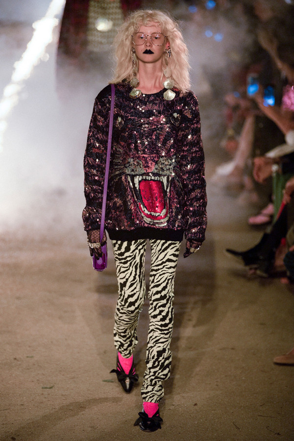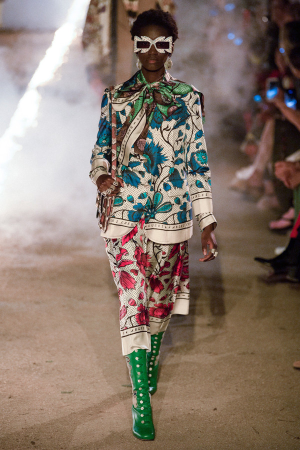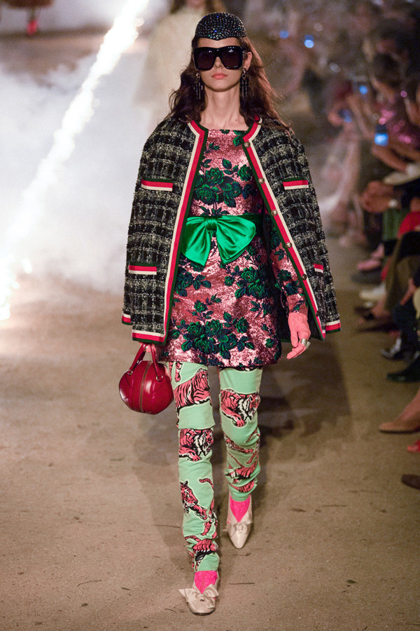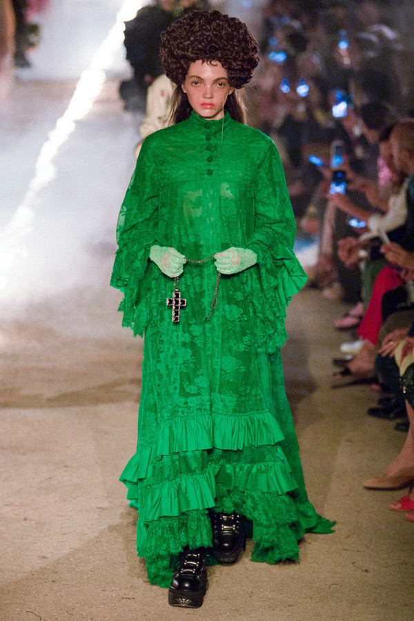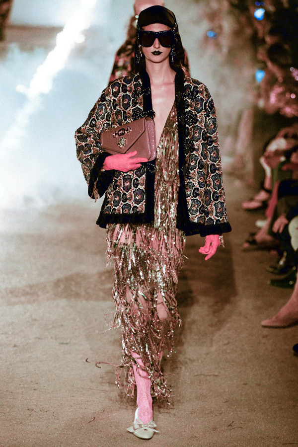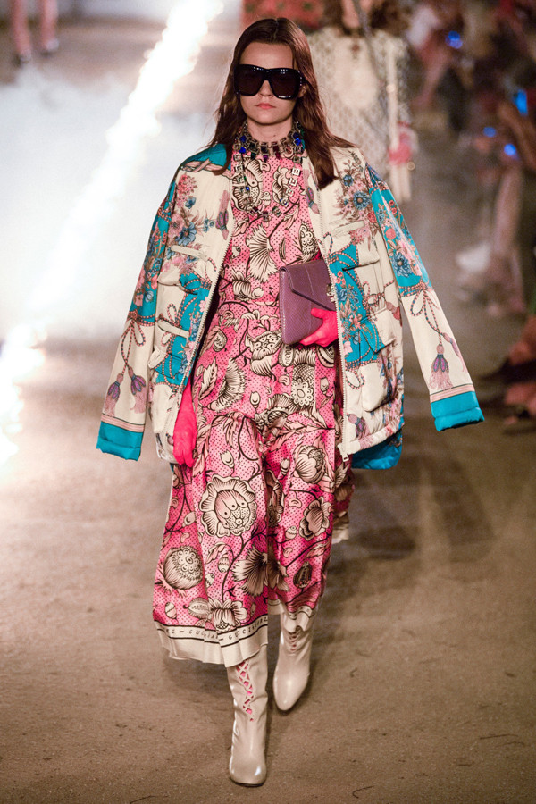 这次也有许多宗教的元素,比如象征着爱与救赎的十字架,始终贯穿了整个系列。再搭配GUCCI固有的元素,颜色跳脱的花卉、动物印花,以及柔情怀旧的百褶纱裙,设计师想表达的人与自然和谐的艺术美学,在这一次与宗教之间再次达到一种平衡与融合。装束酷似修女的模特神情肃穆,胸口部位佩戴着珠宝缠绕仿真肋骨的装饰,这很容易让人联想到15世纪的一种宗教习俗:在亡者尸骨上堆砌珍贵的珠宝,寓意着为对方创造一个华丽的来世,其中蕴含着生死循环的哲学。