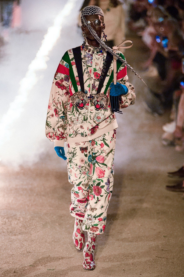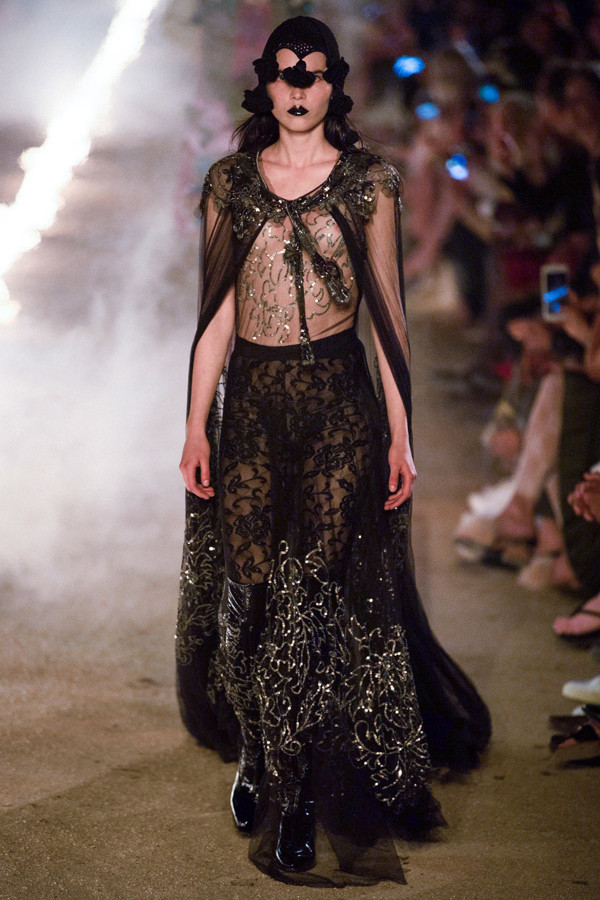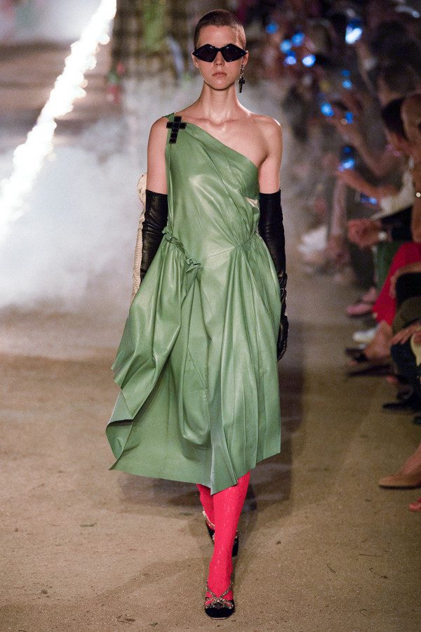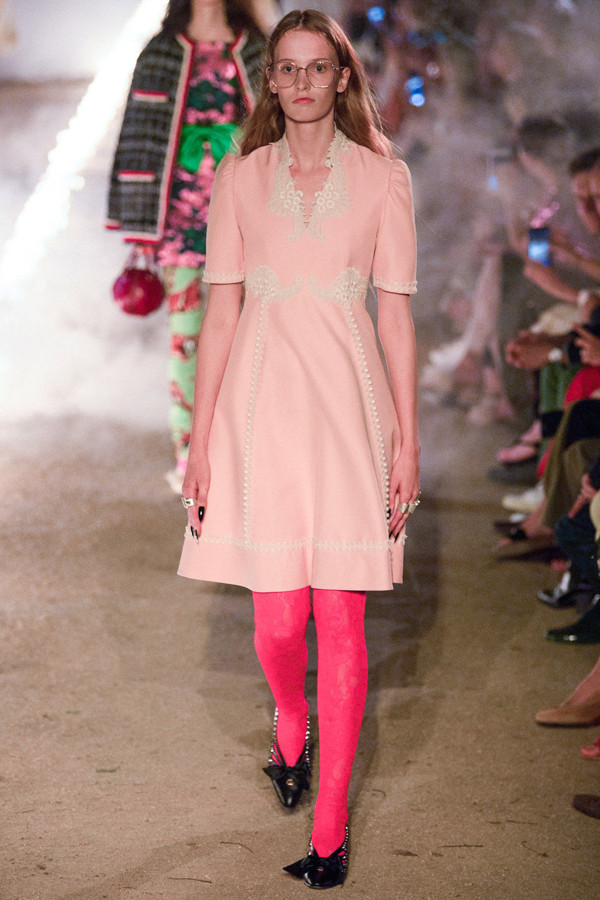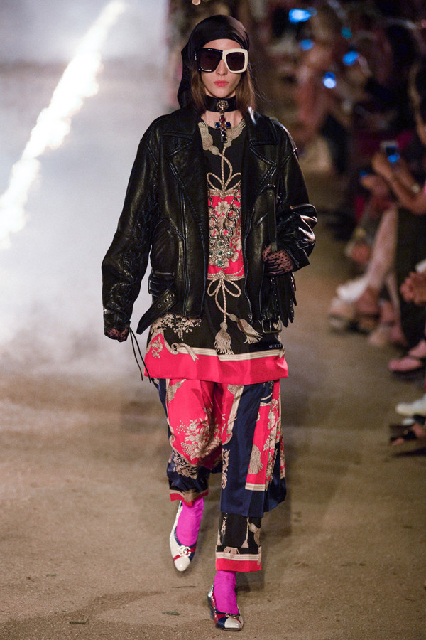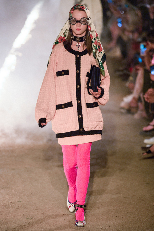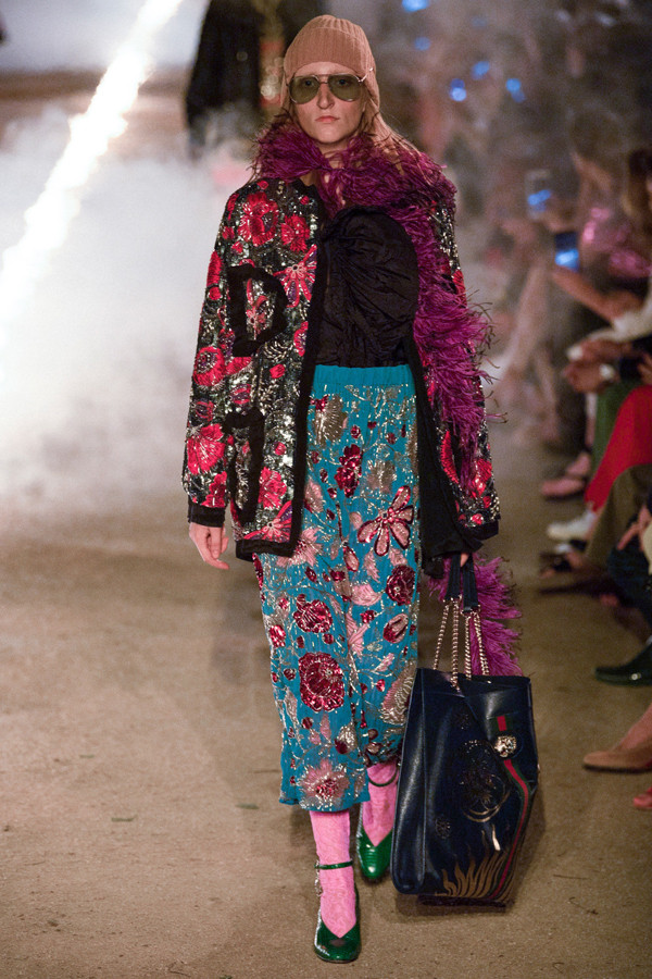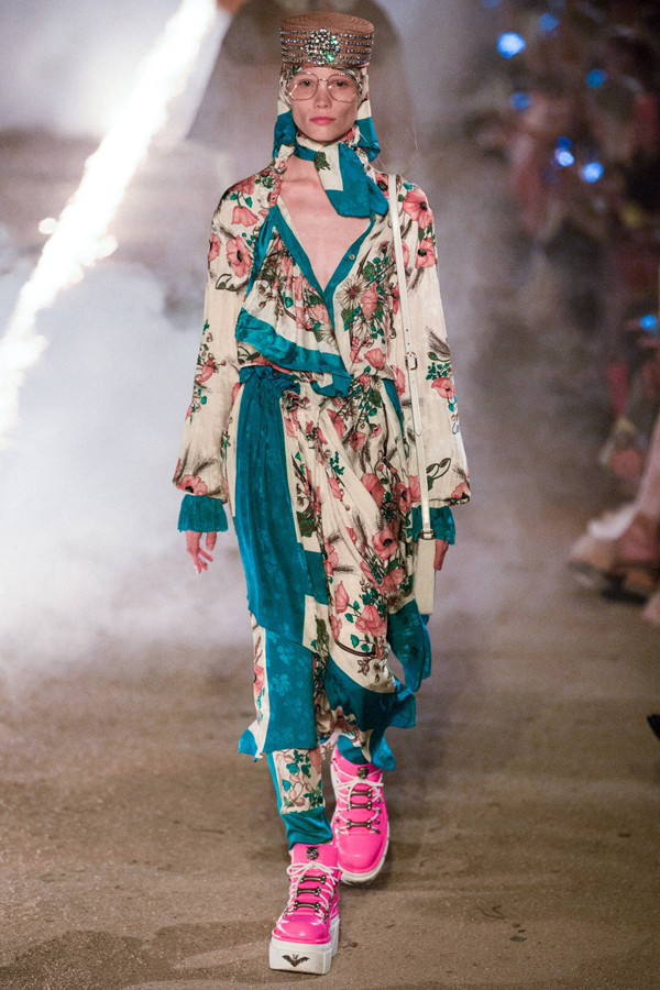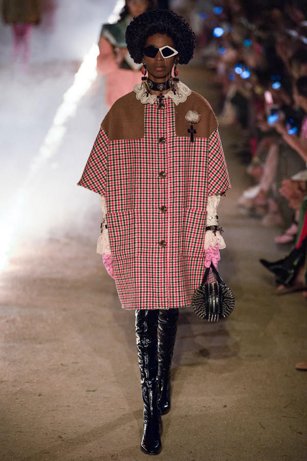 这次也有许多宗教的元素,比如象征着爱与救赎的十字架,始终贯穿了整个系列。再搭配GUCCI固有的元素,颜色跳脱的花卉、动物印花,以及柔情怀旧的百褶纱裙,设计师想表达的人与自然和谐的艺术美学,在这一次与宗教之间再次达到一种平衡与融合。装束酷似修女的模特神情肃穆,胸口部位佩戴着珠宝缠绕仿真肋骨的装饰,这很容易让人联想到15世纪的一种宗教习俗:在亡者尸骨上堆砌珍贵的珠宝,寓意着为对方创造一个华丽的来世,其中蕴含着生死循环的哲学。