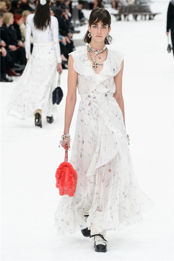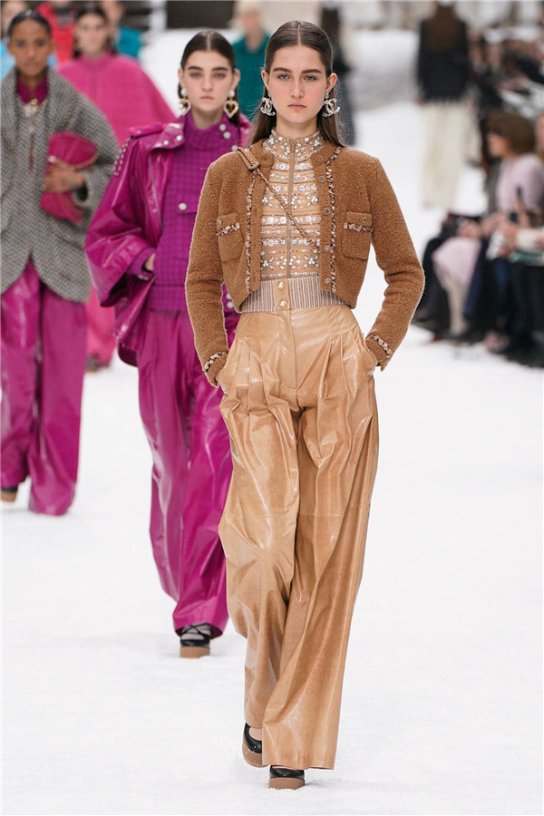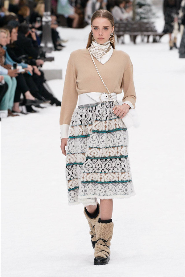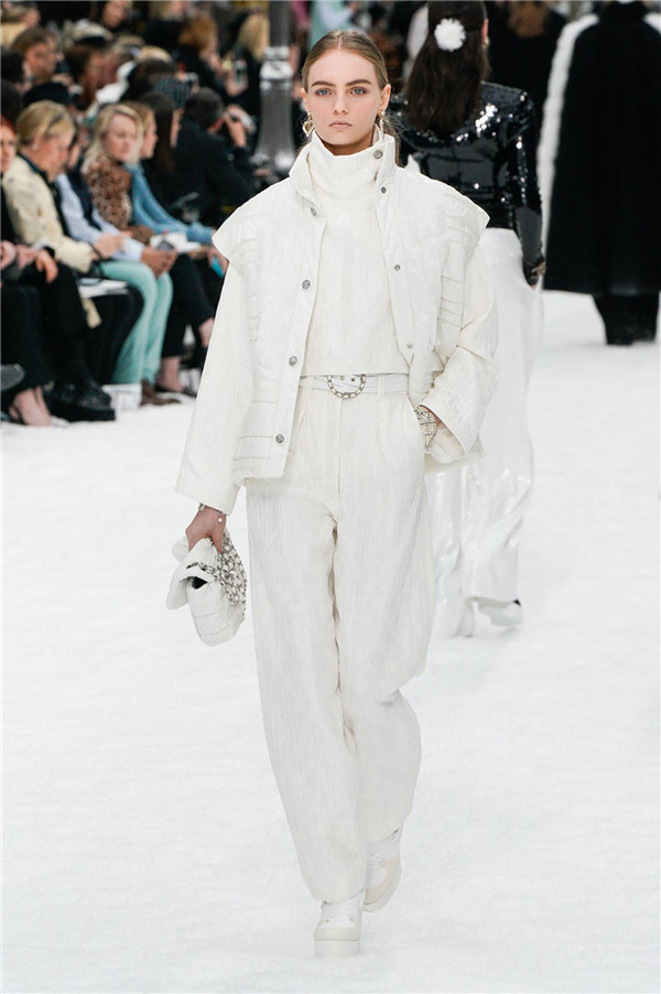 在 Karl Lagerfeld 与 Virginie Viard 的共同创意下,模特们穿着厚底粗跟靴,头戴斜纹软呢帽,优雅地在山间踏雪而行,颇有洒脱浪漫的时髦绅士气派,与香奈儿标志性的刚柔并济的特质。大秀共发布 72 个全新 look,色调以散发冬日气息的白色、米色、黑色和海军蓝为主,穿插几抹亮丽的紫色、桃红、砖红和翡翠绿。