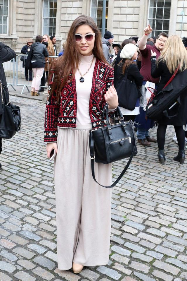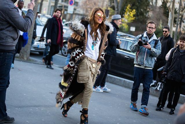 看着身层层叠叠的叠穿效果,里面薄薄的衬衫和机车裤,但是外面的民族风皮草大外套可是hold住了全场!