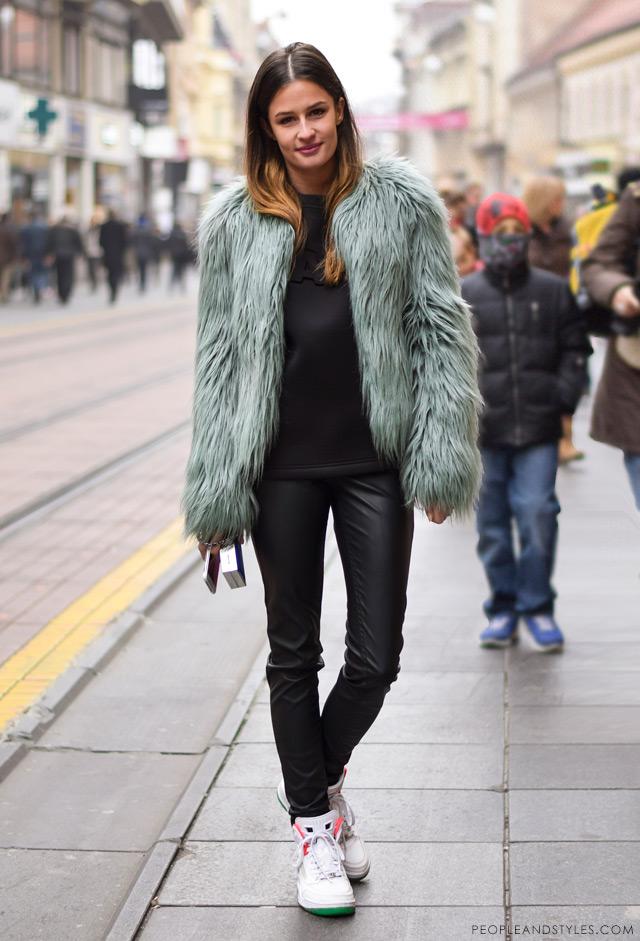 这种look,一身简简单单的黑色,外面的灰绿色皮草外套倒是出挑,一个字,暖!