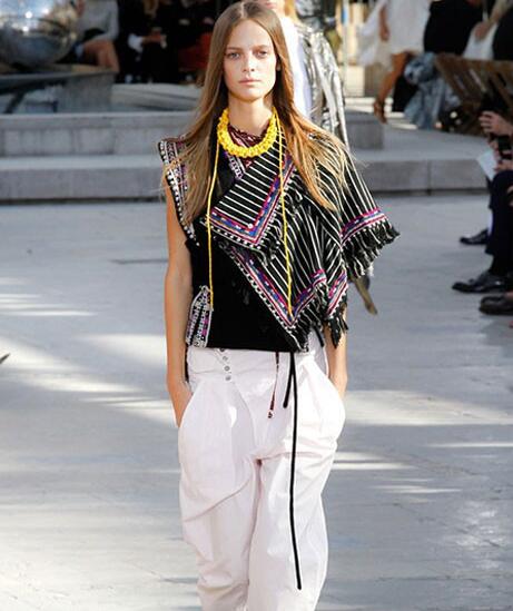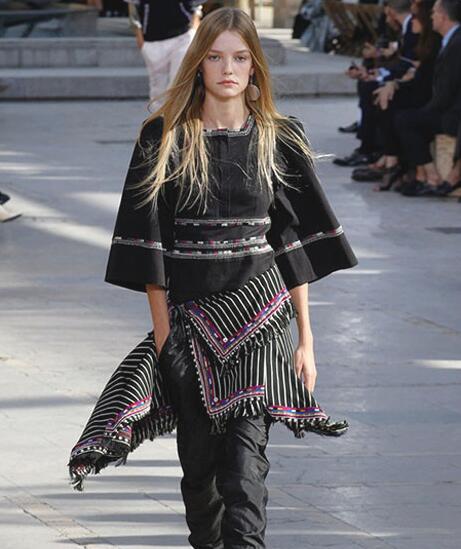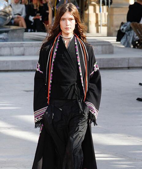 本季设计师描绘了一个经验丰富的旅行者,她的设计灵感来源于她放荡不羁的成长经历,这种经历让深藏于内心的历史与宗教信仰与现代的开放主义相碰撞,所以你看到了深远高山上的藏袍,又忽地转为波光粼粼的金银太空装。
