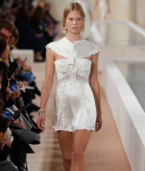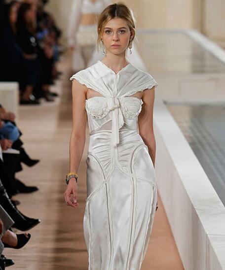 本季是王大仁在Balenciaga(巴黎世家)的谢幕秀,他仿佛再也没有了制约,一切最柔、最软、最温和、最舒适的面料,薄透的蕾丝、仿佛被撕扯般的布料在他手中飞舞了起来,那纯洁的象牙色仿佛他心中盛开的一朵白莲花。