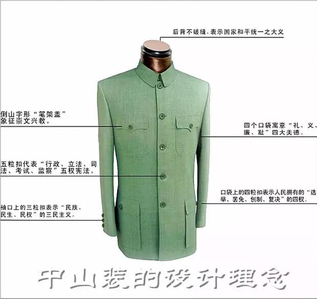 1912年民国政府通令将中山装定为礼服,修改中山装造型,立翻领(最早是立领),对襟,前襟五粒扣,四个贴袋,袖口三粒扣。后片不破缝。这些形制其实是有讲究的,根据《易经》周代礼仪等内容寓以意义: