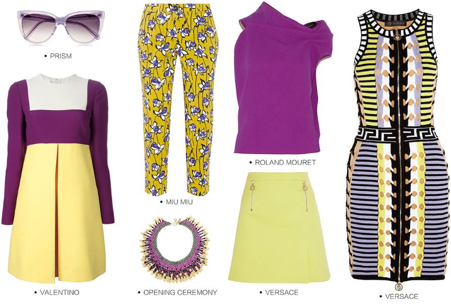 当亮黄色邂逅亮紫色,如此有冲击力的搭配组合大胆出彩之余却又出乎意料地呈现出了独特的活泼动感。这个组合偏向成熟女性风格,夏日派对和办公女郎的必备利器!
