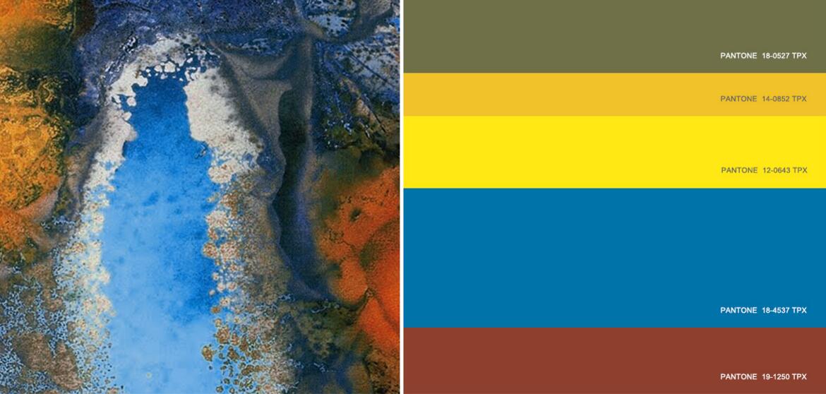 凸显自然色,生态深色池塘绿和锈红色陪衬湖蓝色,搭配野花黄和亮黄色等黄色调。