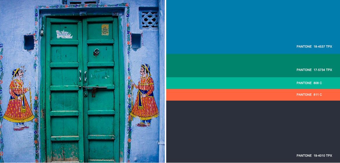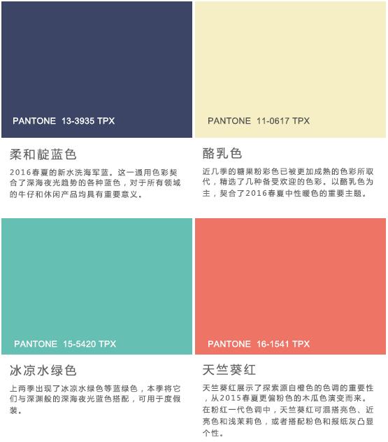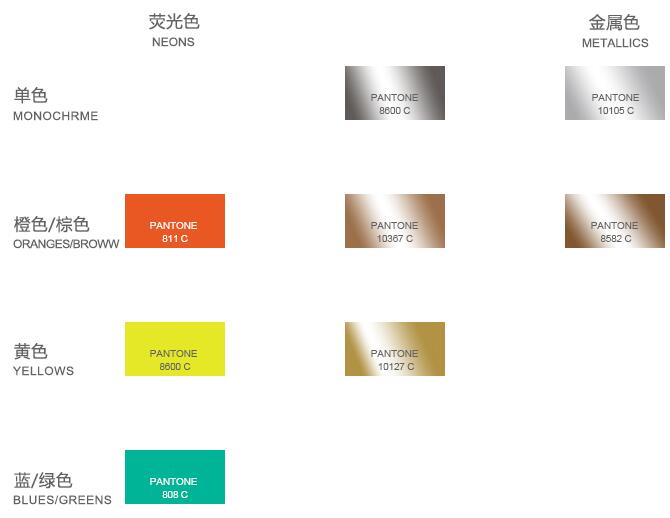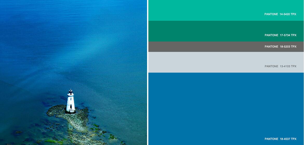 在前瞻性色彩中,青灰色代替传统黑色作为底色,衬托冰凉水绿色,亮水鸭绿和湖蓝色等海洋蓝绿色。漂白蓝代替了传统白色。