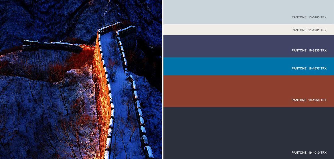 忧郁的色彩组合成为摩登岁月的另一种深度色彩选择。青灰色、泥土色和蓝莓色作为底色,为了柔橙色和红洋葱皮色带来了新意,以乳酪色作为浅强调色。