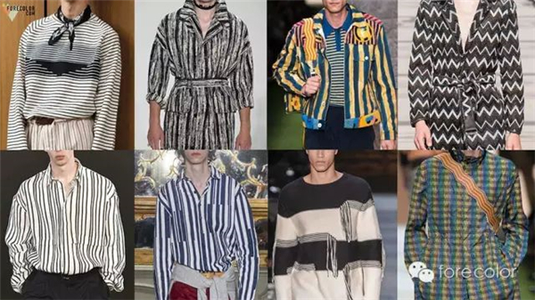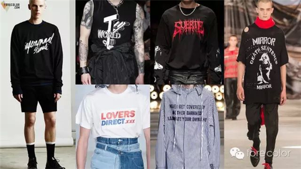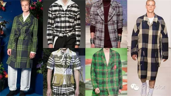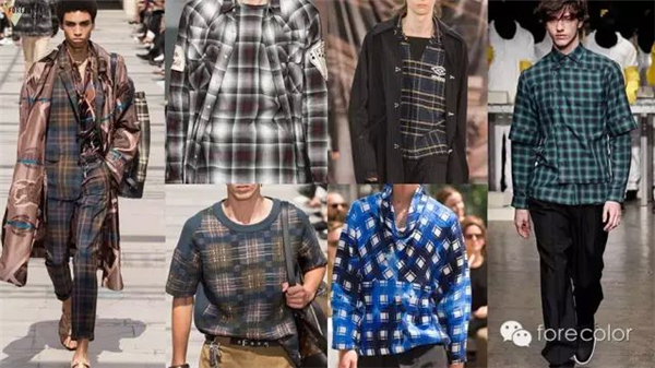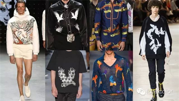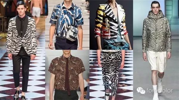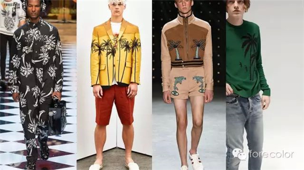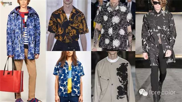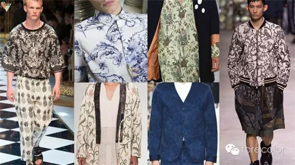 2017春夏花卉植物与条格纹依旧是关键的男装印花元素。简洁的几何图形、比例放大的格纹、多元的混搭条纹,对经典的迷彩图案进行改良变形或加入醒目的色调。近几季的街头叛逆文化依旧影响年轻市场,个性化的字体标语、局部布局的影像图案等带有强烈的暗黑气息与自我意识,民俗图案倾向于传统的印度纹样。