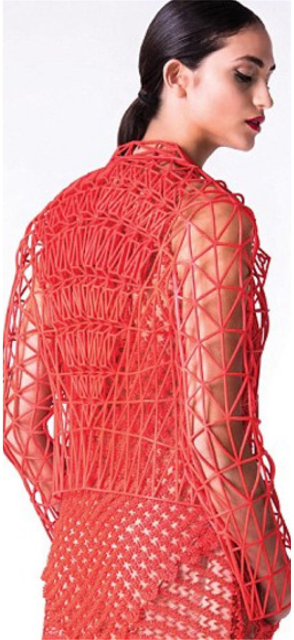 基于腈纶的新型材料,模仿橡胶,柔韧性和持久性极佳。这是3D打印时装设计的重大突破,同时反映出设计与科技的完美结合。