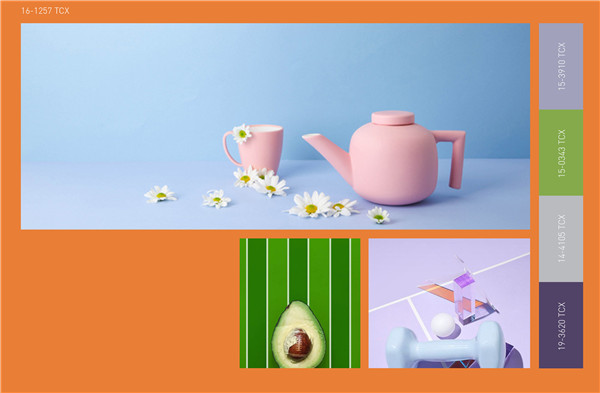 本季太阳桔和尼罗蓝作为关键色,高饱和度的柠檬黄、火焰红、桔红以及草木绿、尼罗蓝搭配,彰显出夏季浓浓的热情活力与舒畅自在,暗色调宫廷紫、鳄梨绿,浅淡色系冷蓝色、淡蓝紫、冰柠檬黄、清水绿、玫瑰星云粉、以及微芯片色、海鸥灰组合搭配并融合,为整个色盘注入沉稳、清新以及柔和的气息,共同带来清新浪漫又不失热情的色彩组合,打造一个灿烂美好、清凉舒适的夏季。