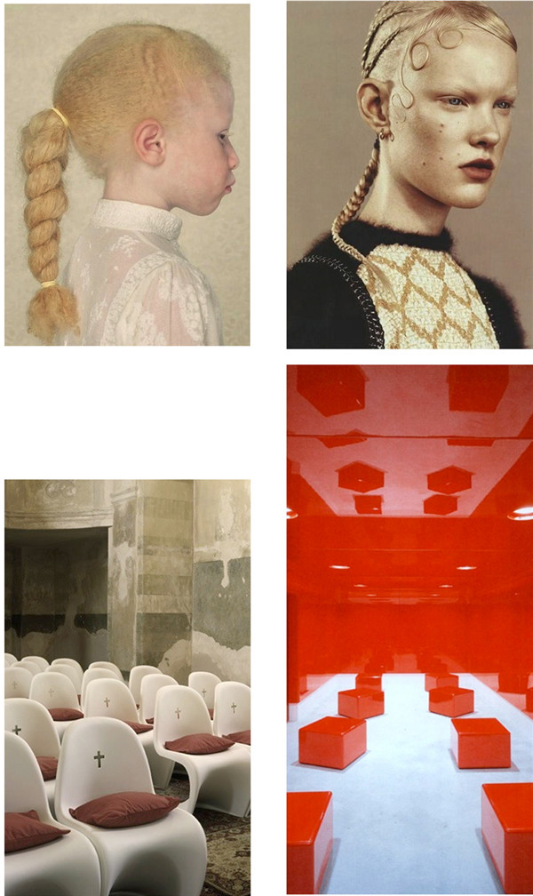 激烈的猩红色、亮玫红是经典的红色系代表,浅卡其色、黑白中和整个色盘,打造个性鲜明的调色盘。