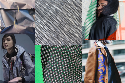 锥形交通路标、护栏和沥青地面等现代都市元素的色彩和纹理,启发出具有车辙结构的压花线缝、网眼织物和粗糙的都市风粗花呢,共同演绎2018/19秋冬工业风的面料风潮。