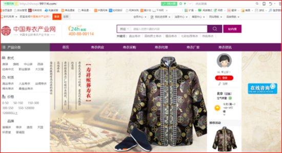 中国寿衣产业网作为殡葬行业专业的网站,行业客户可通过这个网上行业集群平台,建设自己的网上店铺,开展线下与线上有机结合的新型营销模式,方便异地业务开展;并与具有单品优势的实体企业共同构建了单品电子商务交易平台,准确及时发布行业动态,行业资讯,寿衣生产企业从建网站、做网络广告来开展网络营销,通过掌控一个单品电子商务平台实现产业升级,实现品牌打造、产品文化提升,获得网上增量交易的价值,从单一的开展网上零售,到利用单品电子商务平台开展采购、分销批发和企业客户定制等多种网上交易模式,可以快速找到上游原材料生产企业和下游批发分销客户,节省成本,提高效率,让每家企业都能在网库的平台进行精准的询价和报价,对客户进行分级管理,针对单品分级发送报价,并可查看报价发送效果,主动出击不再坐等需求采购客户。