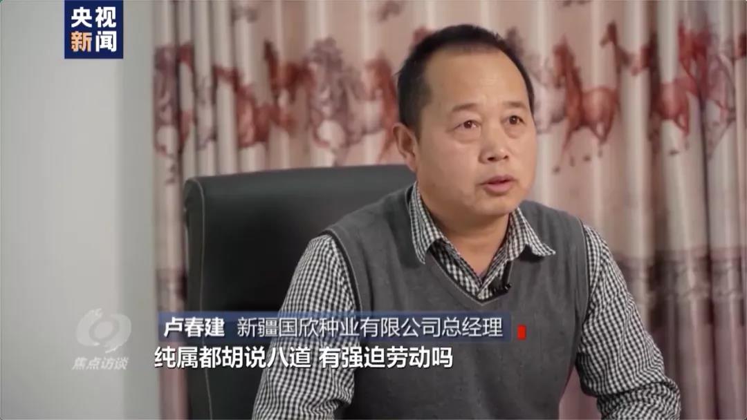 新疆国欣种业有限公司总经理 卢春建:纯属胡说八道。我不知道他说这个话的目的是看到了还是听到了,还是胡言乱语,说这个话是不是有什么目的。今年招聘的时候,本来应该是八十多个人,来了将近一百六七十个人。我们要是强迫劳动,会来这么多人吗,会这么积极吗?