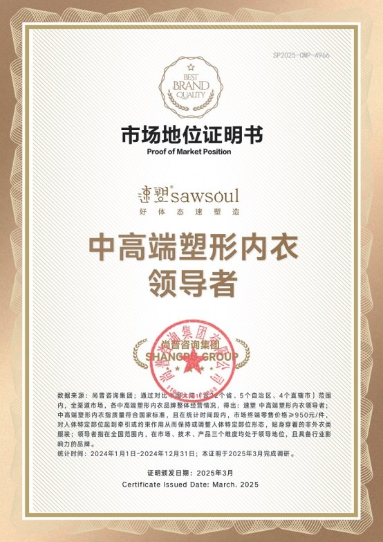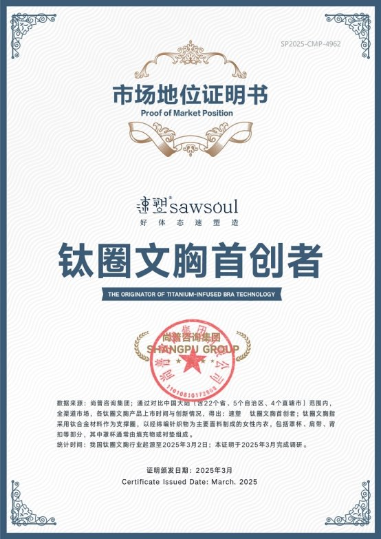 2025年3月,广东速塑服饰有限责任公司旗下内衣品牌速塑,获得尚普咨询集团有限公司(以下简称“尚普咨询集团”)颁发的“速塑 中高端塑形内衣领导者”和“速塑 钛圈文胸首创者”市场地位证明书。该证书由尚普咨询集团有限公司出具,数据基于尚普咨询集团对全国范围内,全渠道市场,女性内衣行业调研分析及对比得出。