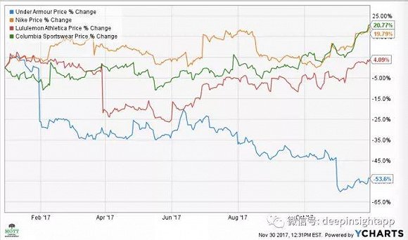 曾经的明星股UA,在今年也出现了暴跌。事实上过去两年UA是表现最差的体育运动品公司。先发优势没有把握住以后,开始出现了增速放缓的迹象,逐步演变成负增长。曾经人见人爱的高逼格运动紧身衣,如今也退去了光环。