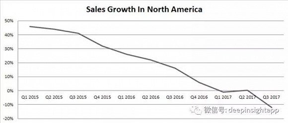 从下图我们发现,UA在北美市场的销售增速从2015年一季度最高的40%以上,一路下滑到了最新一个季度的负增长。