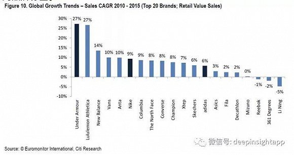 下面这张图是2010年~2015年全球所有运动品牌的年复合增长率。我们看到排名前两位的就是UA和LuluLemon。都是代表了一个细分市场的龙头,有强烈的品牌标签。