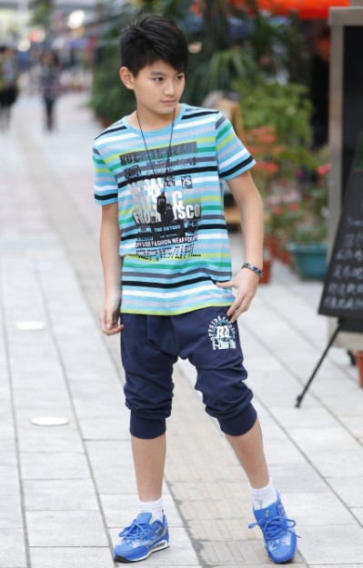 一到夏季,在满大街的潮人装扮中,映入你眼帘的是不是就数T恤最多了?要知道,一件好T恤,不管内衬还是外穿,都能让人散发时尚的光芒。就像“offside 越位”少年装这件横纹T恤,采用白色、浅黄、粉红、海绿、靛蓝、黑色、灰色等多种颜色条纹,在青绿色面料的配衬下,打造出别样的夏季风情,带来一种邻家男孩的感觉,让少年显得更清秀。柔软、轻盈的薄棉裤,代表了休闲的风范。一双天蓝色的慢跑鞋,适合随时想运动的少年。这身衣着装扮舒服、自在,属于很常见的搭配,却带有很独特的时尚感。高温仍在继续,“offside 越位”少年装融入夏季的热情,为少年带来了凉快和时尚。