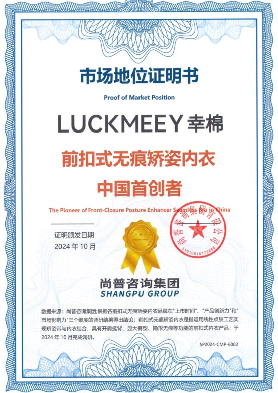 2024年10月,广州幸棉网络科技有限公司(以下简称“幸棉”)荣获尚普咨询集团【幸棉,粉底液内衣全国全网销量第一】【幸棉,前扣式无痕矫姿内衣中国首创者】【幸棉,无感无痕粉底液内衣中国首创者】市场地位证书,标志着幸棉在我国内衣行业中的卓越地位及市场的高度认可。