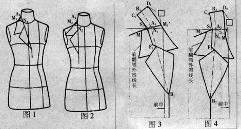设图1、图2中的领孔宽、预侧处领腰高、肩线处领面宽都相等,由于驳折线的角度不同,颁侧处的领面宽构成差异,MlNl>M2N2使平面结构图3、图4中的后领图形构成差异,即后领腰上口围度、后翻颈外围线结构的线型发生了差异,甚至被线型变化而构成误导,会影响后领腰高、后中心尺寸。所以认清翻驳领肩线处领面宽与颈侧处领面宽的区别十分重学。