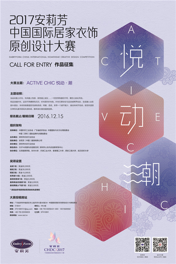 地址:广东省深圳市福田区车公庙天祥大厦AB座3A中国国际居家衣饰原创设计大赛组委会 邮编:518041